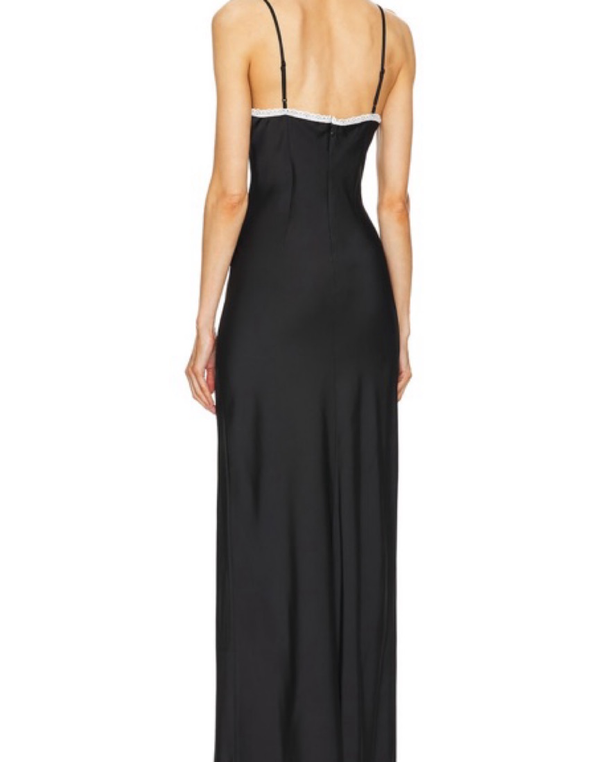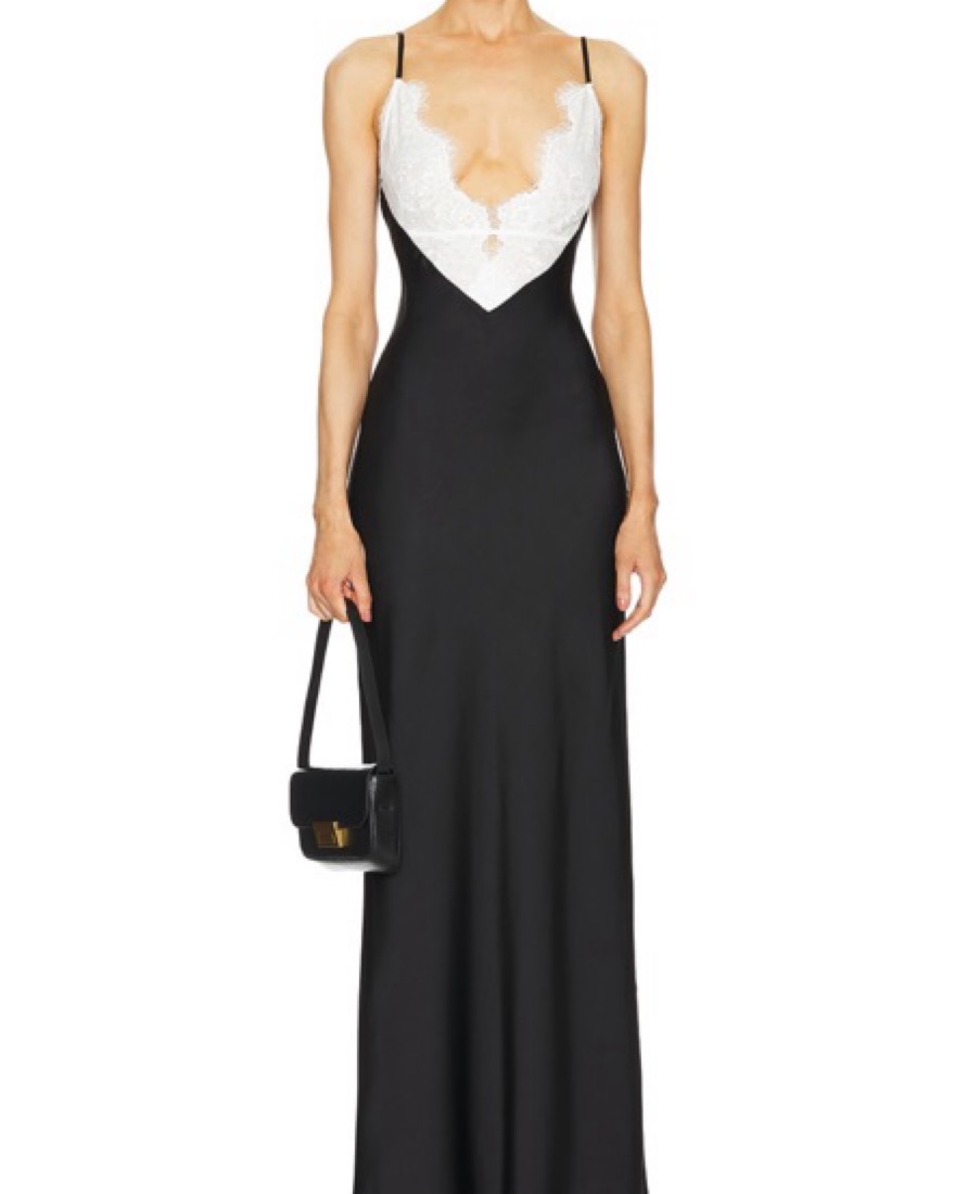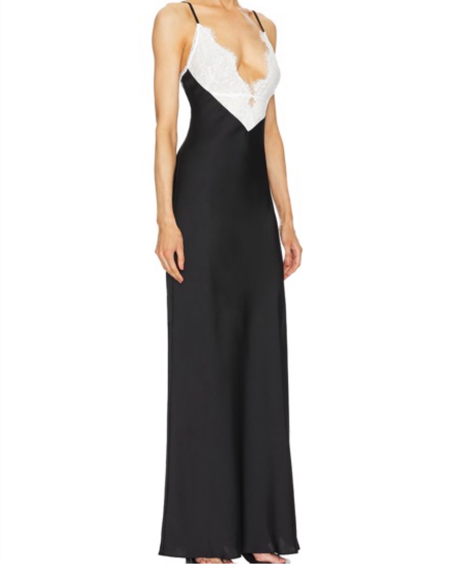 This stunning maxi dress features a flattering black silhouette with delicate white lace accents for a touch of elegance. It's perfect for a formal event or special occasion.