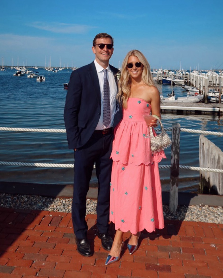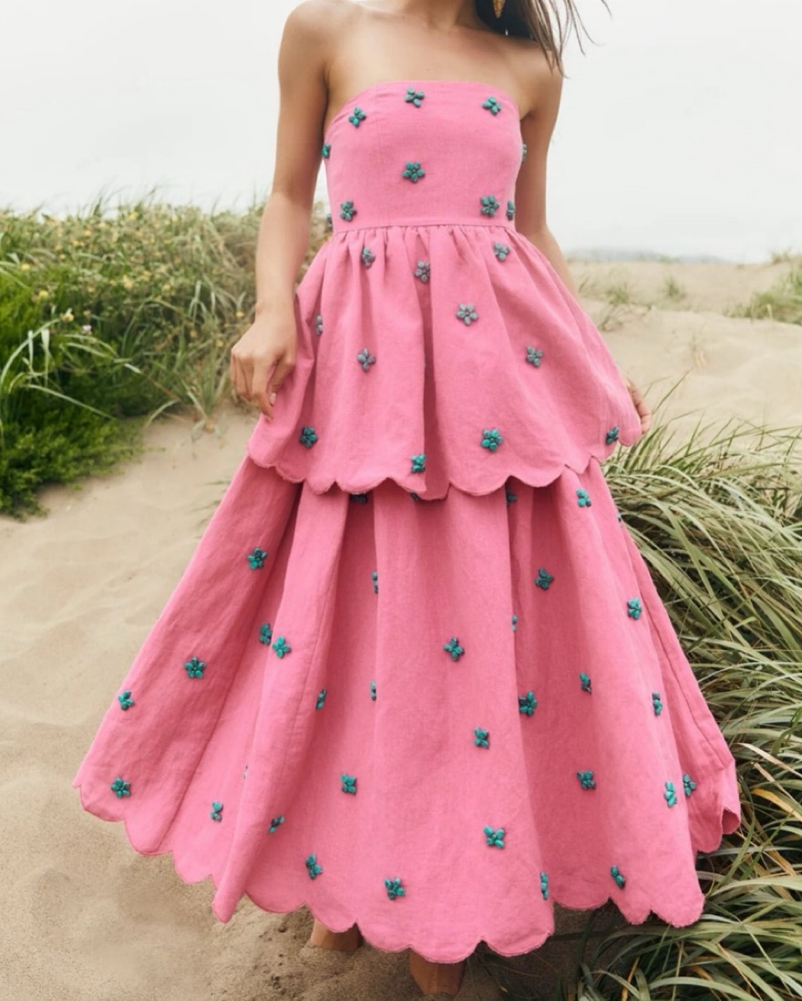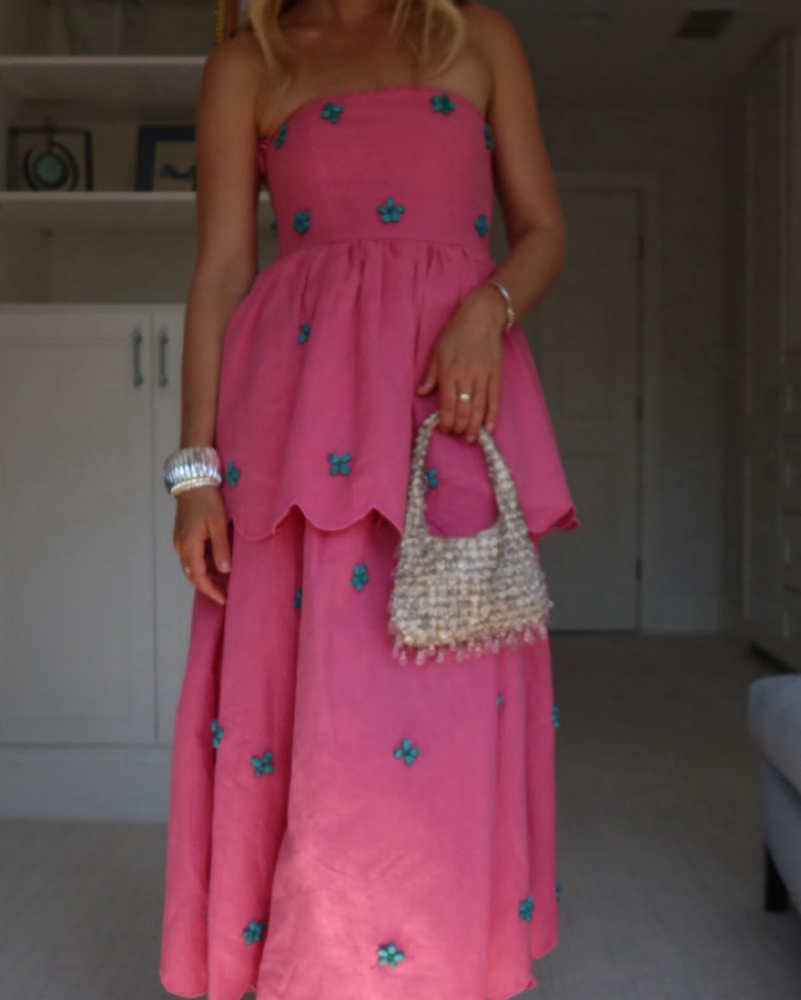 Bright pink with turqouise beading - rental pricing a bit higher because it’s super fragile!