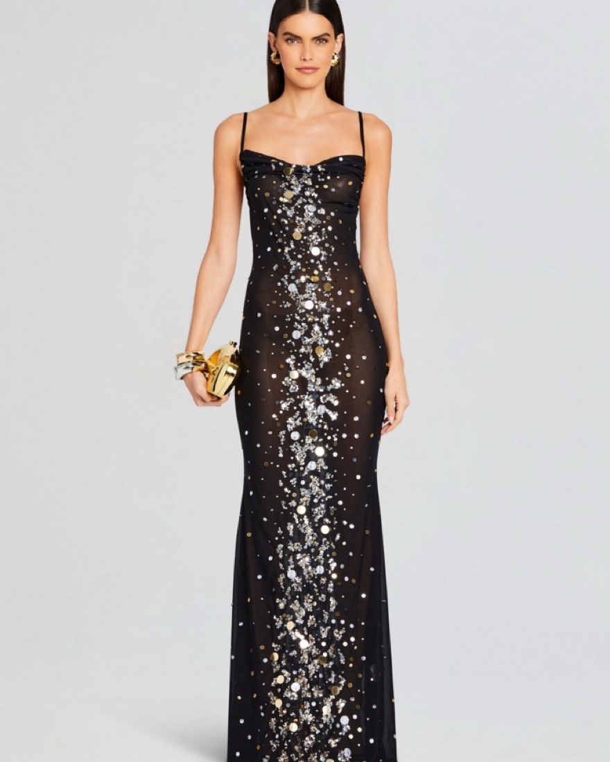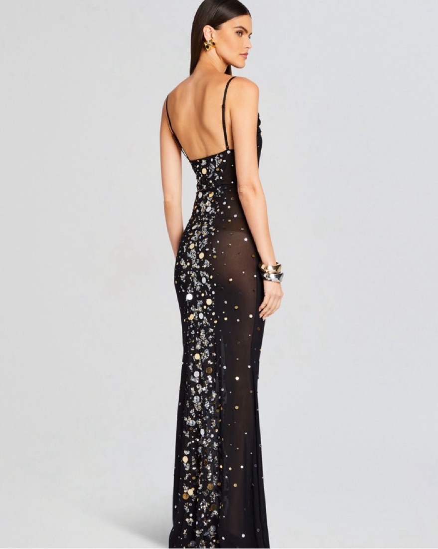 Steal the spotlight, designed to make you stand out from the crowd. This gown features intricate silver and gold embellishments that catch the light and sparkle with every movement. Perfect for special occasions or glamorous events, this dress exudes sophistication and style.