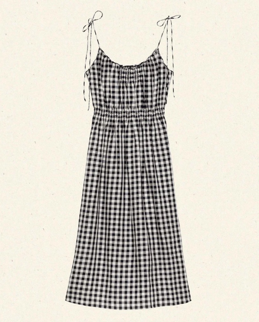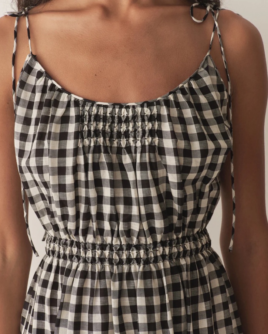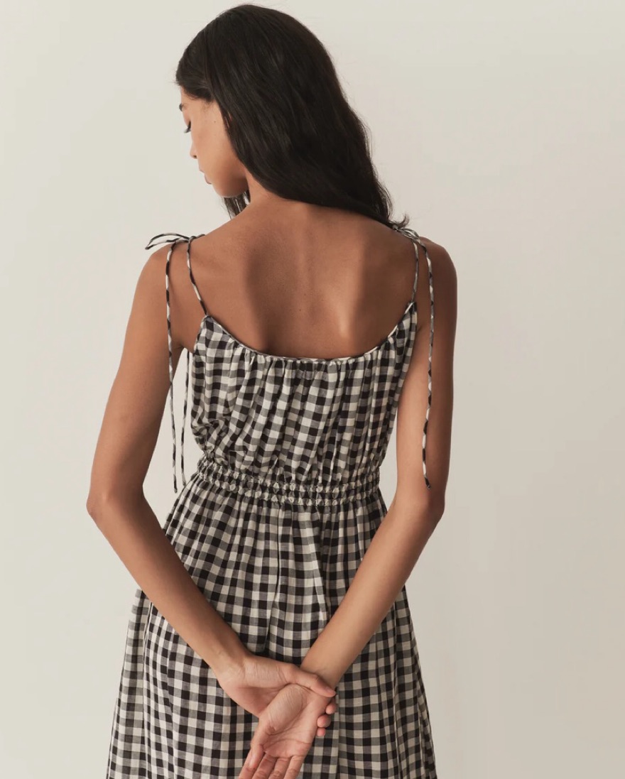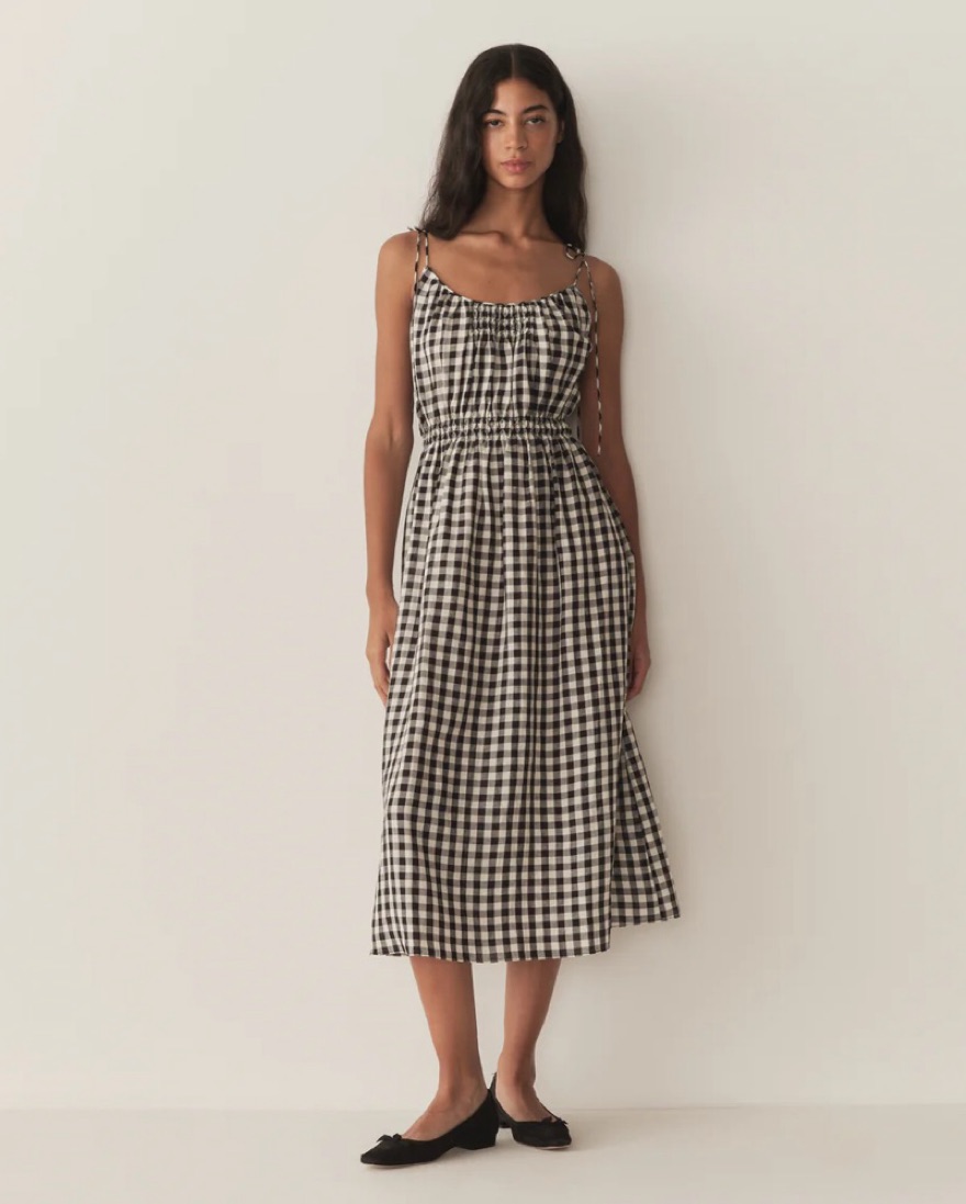 Lightweight rayon-linen black gingham dress with cute tie shoulders. So breezy and comfortable and cute.