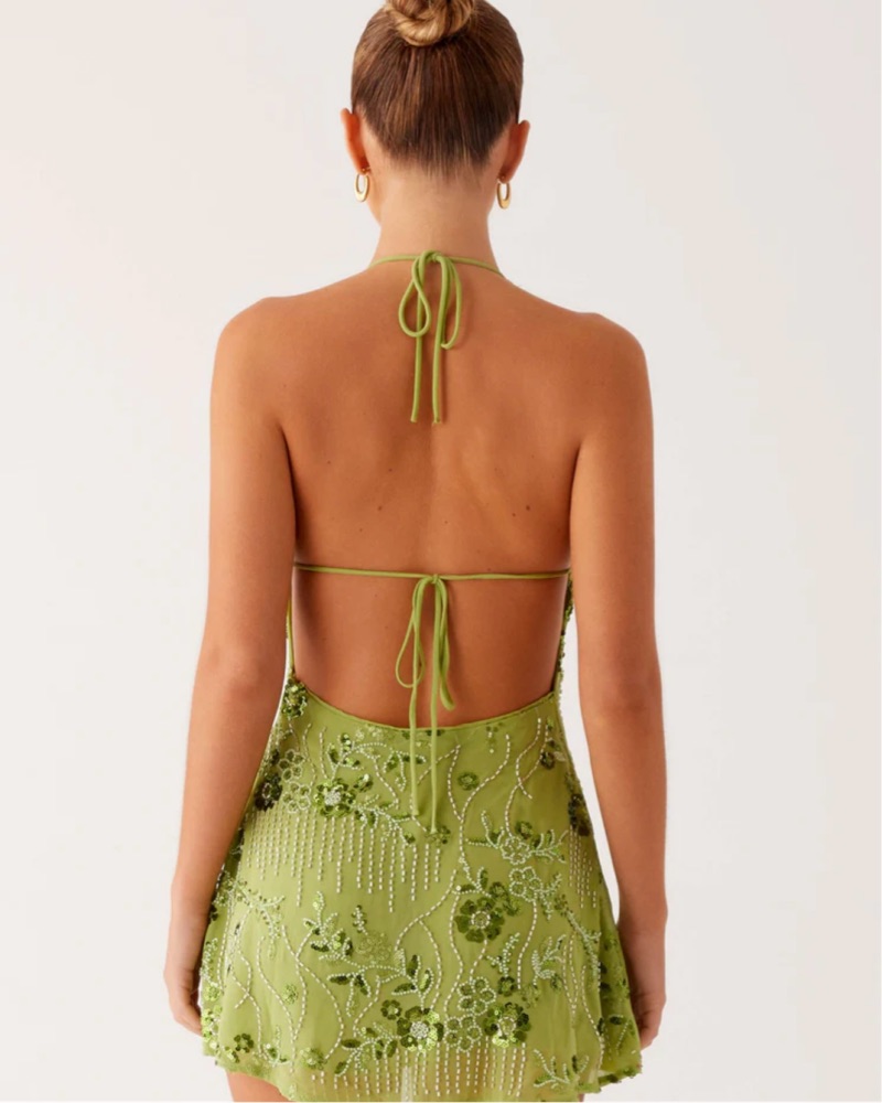 Featuring a halterneck silhouette and glistening beaded fabric, this green mini radiates club-ready energy and unforgettable allure. - Mini length