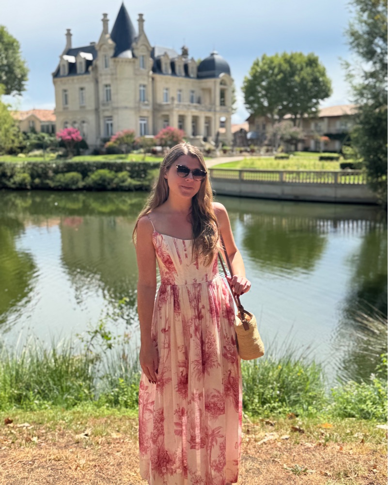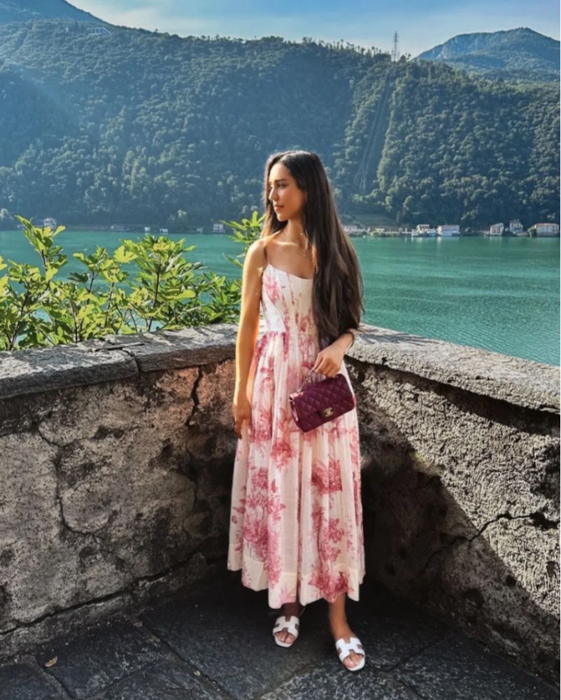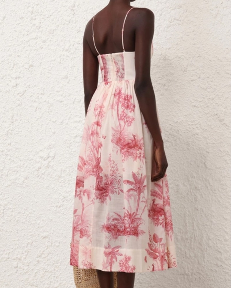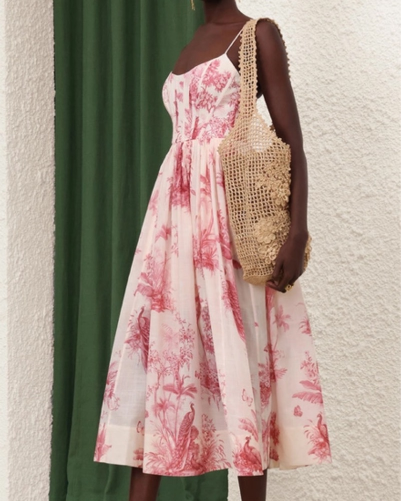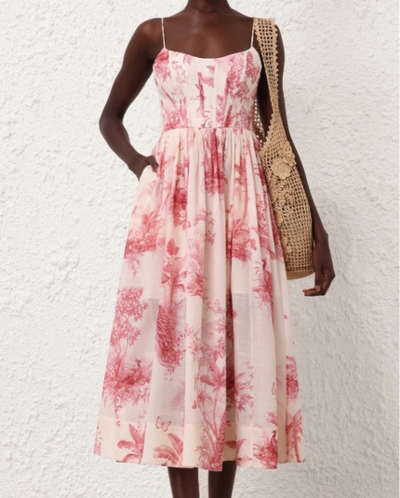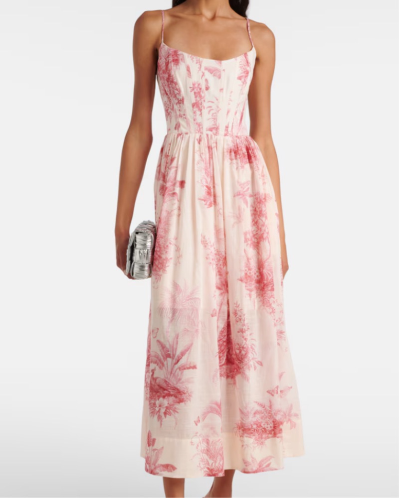 The Waverly Corset Midi Dress in Pink Palm from Zimmermann’s Summer Swim 2024 Collection. A cotton midi dress featuring a corset bodice and full skirt with adjustable straps and side seam pockets.