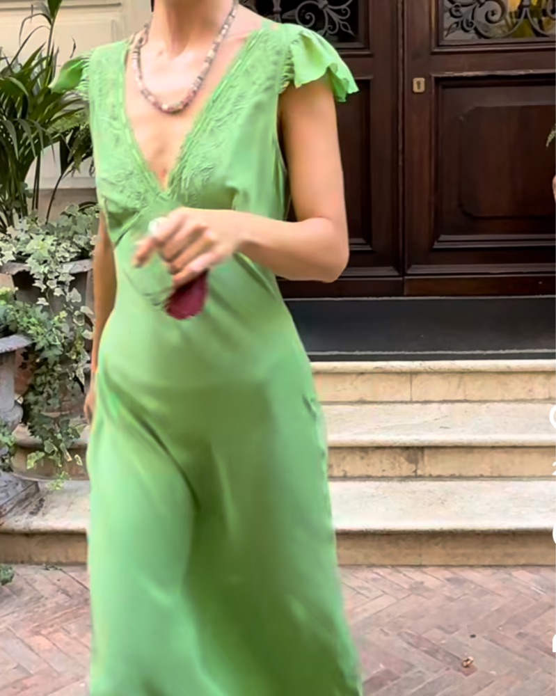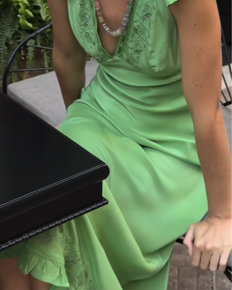 This stunning green maxi dress is perfect for a summer evening event or wedding guest attire. The intricate embroidered details and flowing silhouette create a truly elegant look.
