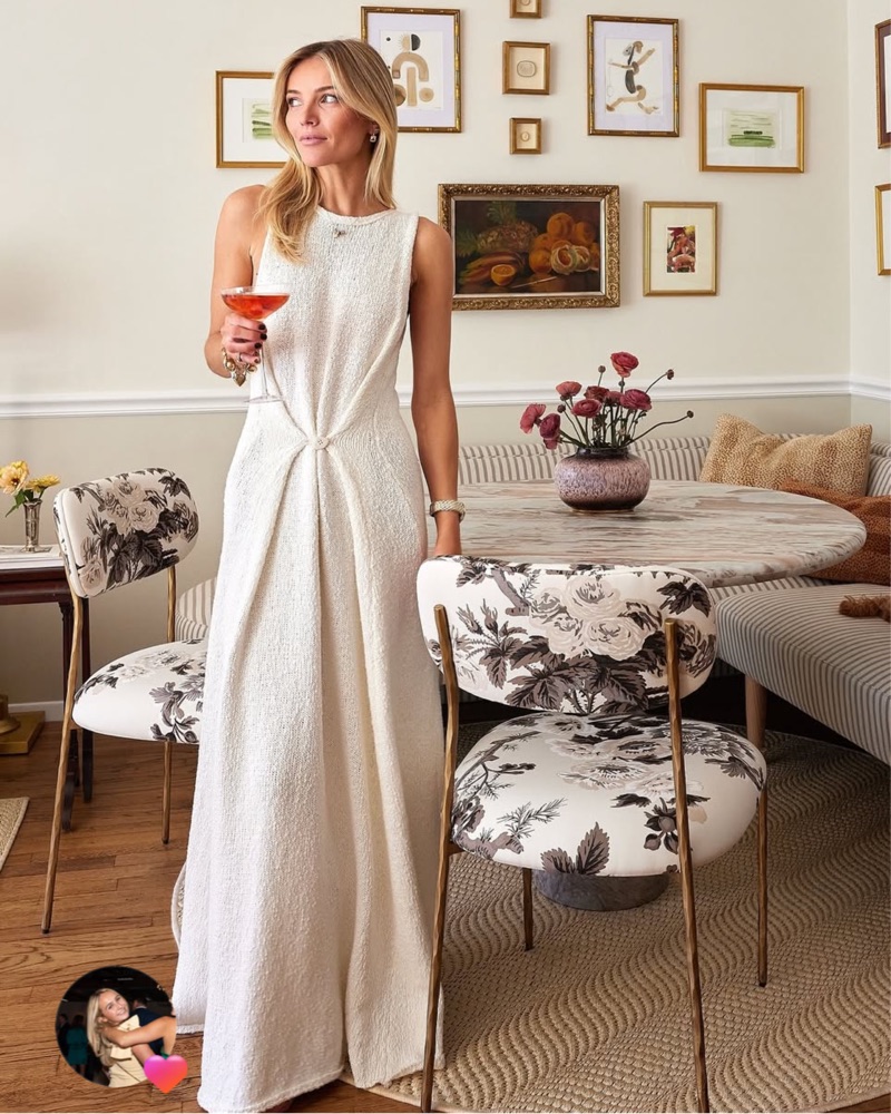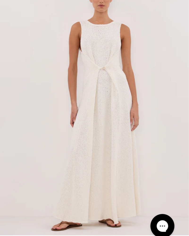 Sleeveless textured boucle knit maxi dress Round neckline Statement button feature at centre front to cinch the silhouette