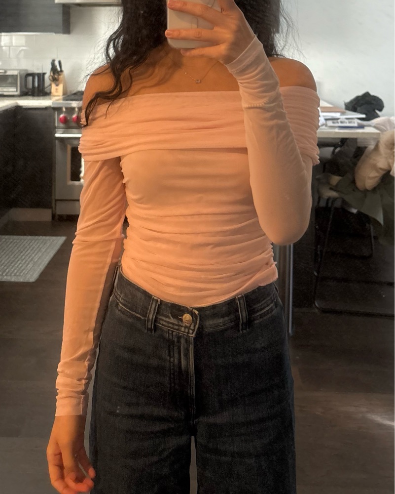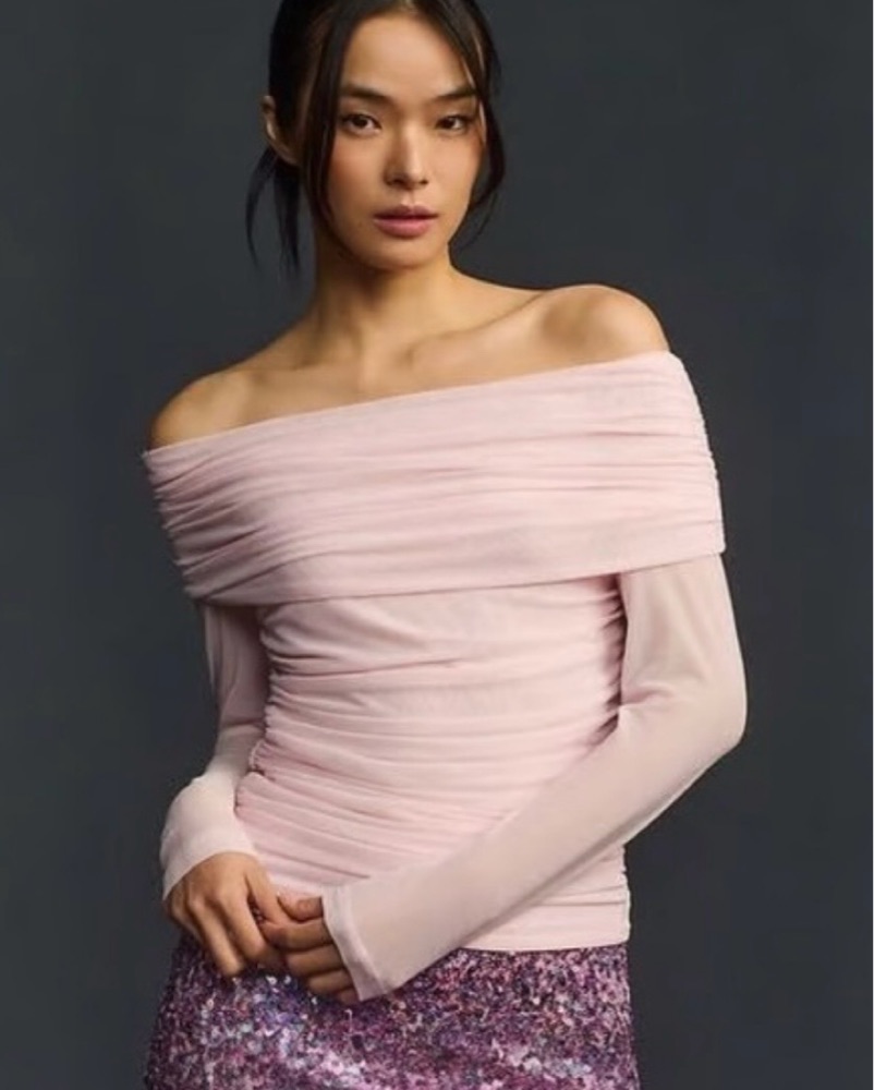 Light pink mesh off the shoulder top. Brand: Maeve, anthropologie