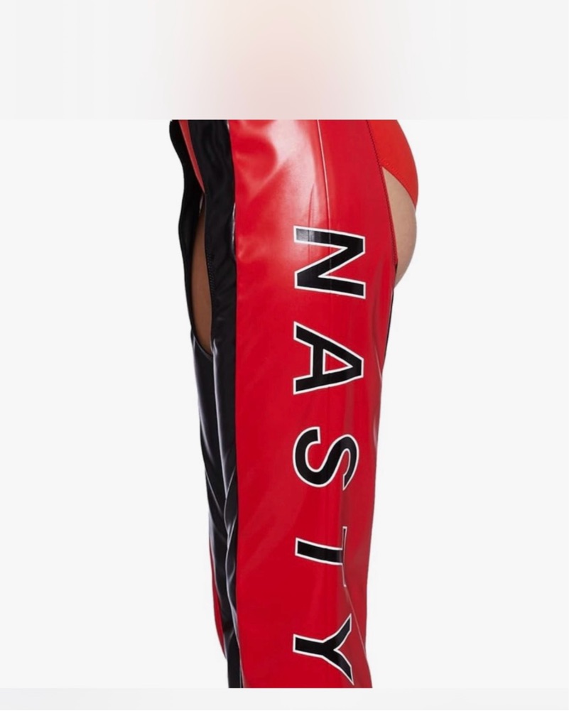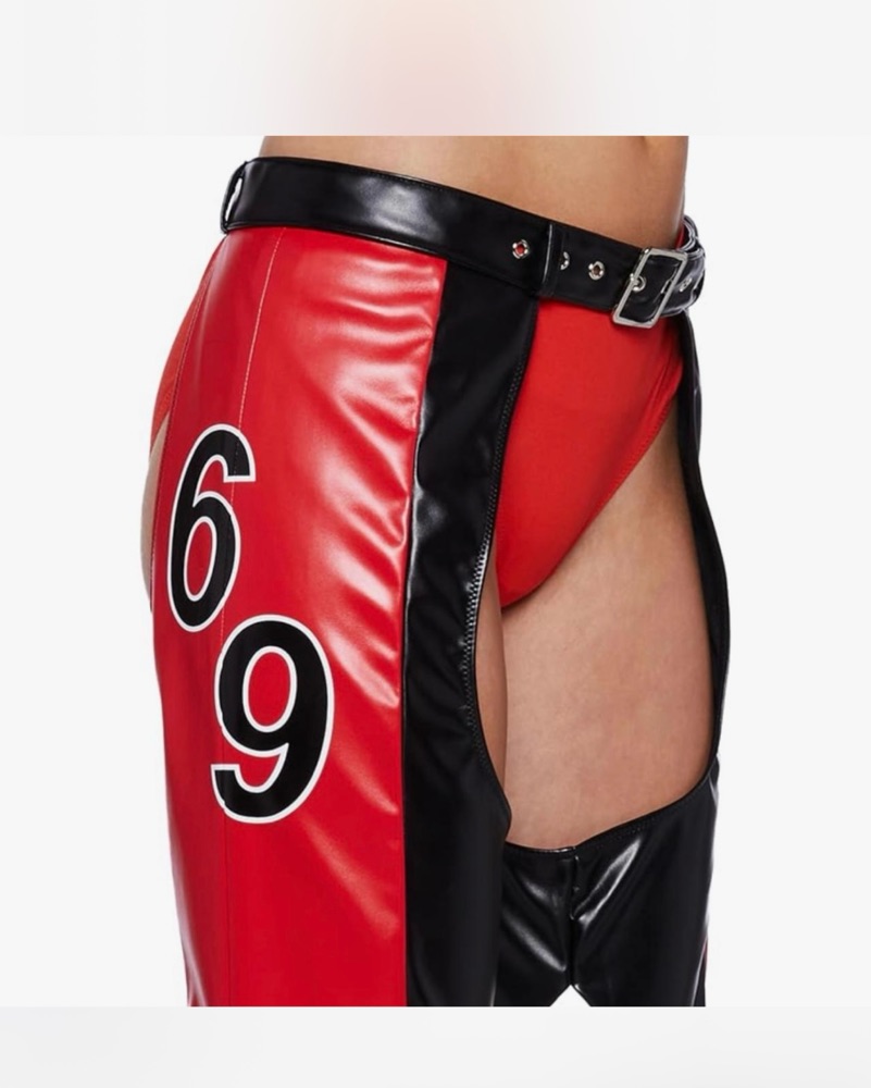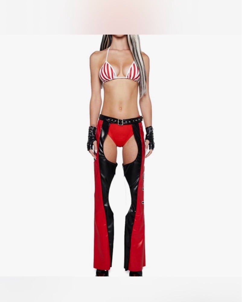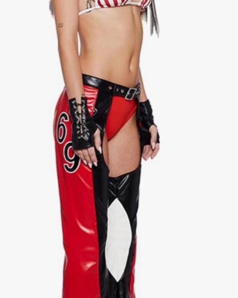Includes bikini top, wig, and pleather chaps. Soooo cute, have never gotten more compliments on a costume!