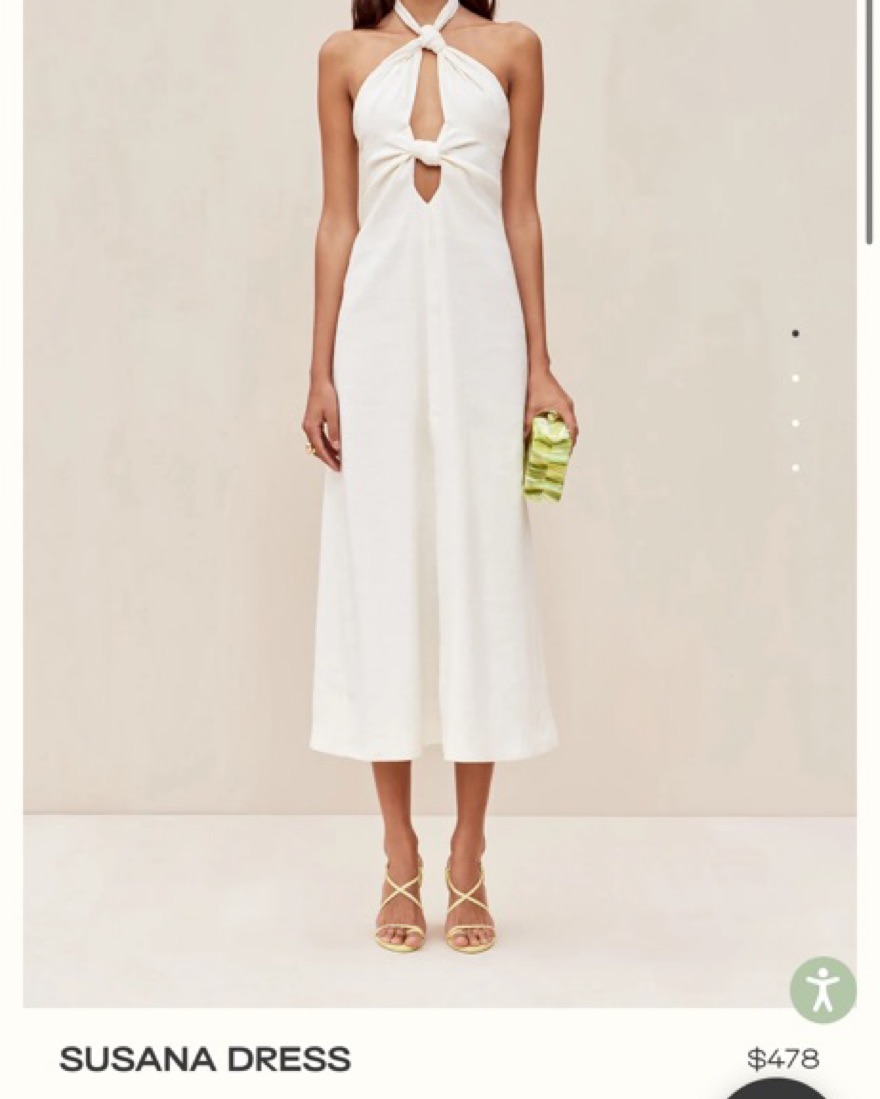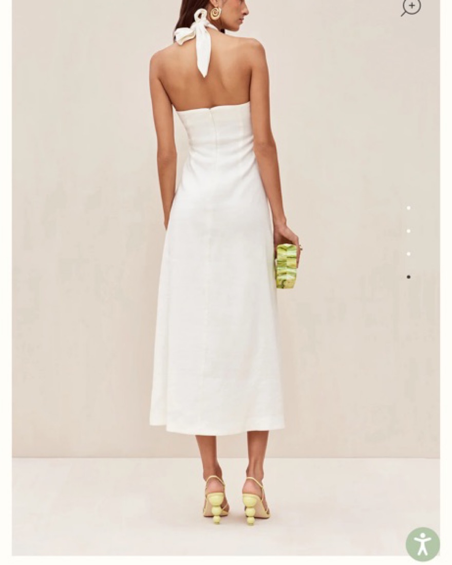 Is a halter dress featuring signature Cult Gaia cutouts at the bust. The cutouts are created from two chunky knots. Her halter neck ties at the back. She is lined and her linen blend fabric is slightly stretchy. There is a center back zip for adjustable wear.