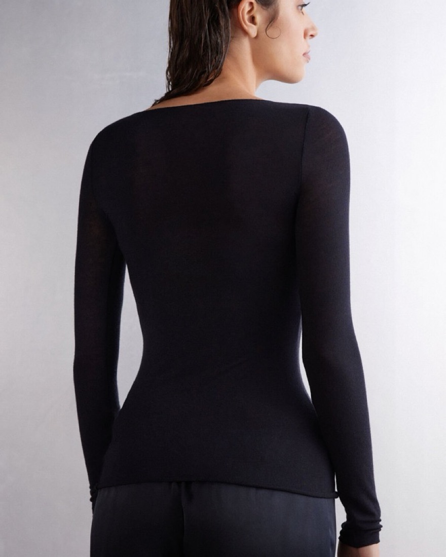 Crafted from ultralight modal and cashmere, this sheer boat neck top offers an incredibly soft and breathable feel, making it ideal for layering or wearing on its own. The elegant boat neckline frames the shoulders. The ultralight material’s sheer nature gives it a delicate and refined look.