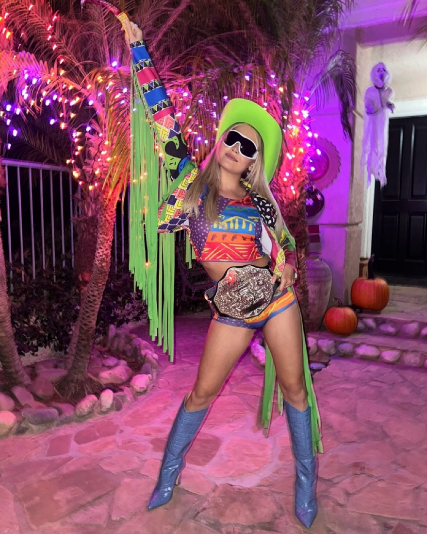 Now’s your chance to be a WWE superstar!! 😎 Niche but adorable. Outfit comes with green fringe jacket, crop top and shorts, hat, glasses and a heavyweight champ belt. I suggest pairing with fun knee high boots!