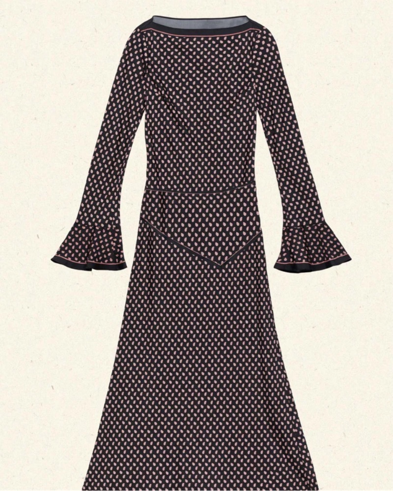 Crafted from soft silk-viscose twill and rendered in our Cardinale Foulard print—inspired by a vintage handkerchief—the Davina Dress features a bateau neckline, flared full-length sleeves, and an easy fit. A loosely fitted bodice with an invisible side zipper extends into an ankle-grazing, bias-cut