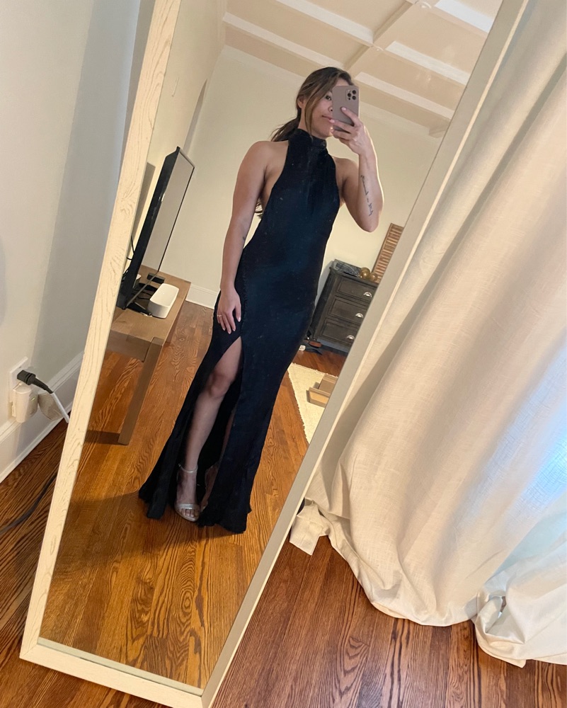 Super sexy and sleek gown. I am 5’ 1” and wore 4 inch heels and this fit perfectly - no alterations needed. I love love love this dress because it made me feel so good. Perfect for a black tie event. Dry cleaned and ready for you!