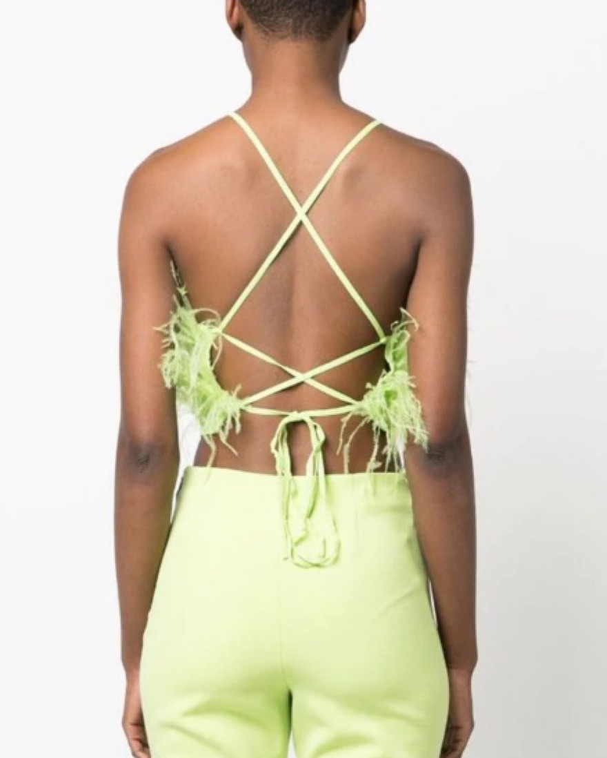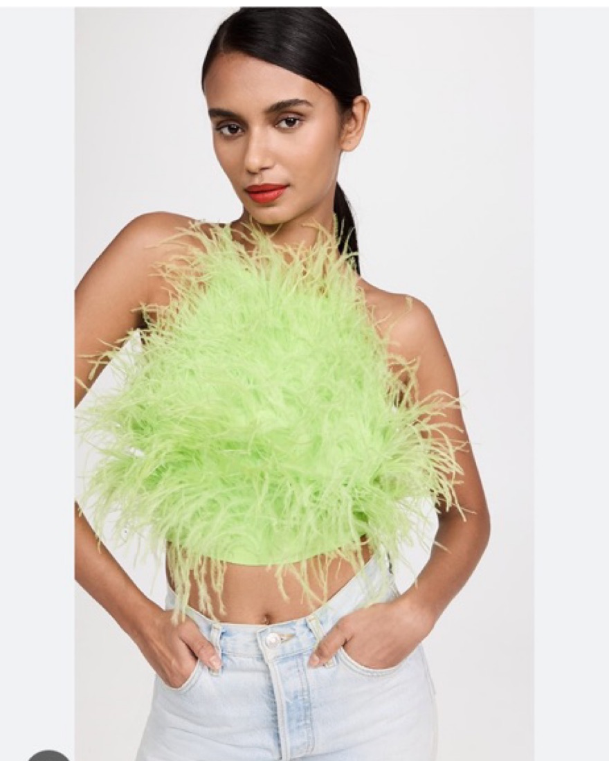 One of my favorite tops, perfect for going out or just a fun occasion. I always get so many compliments. Please be careful if renting as feathers are delicate!