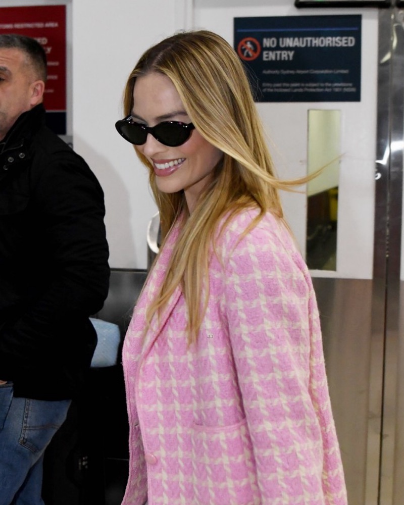 As seen on Margot Robbie in Barbie press tour. Black with yellow letters