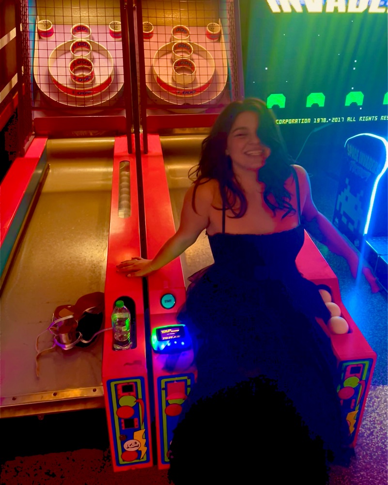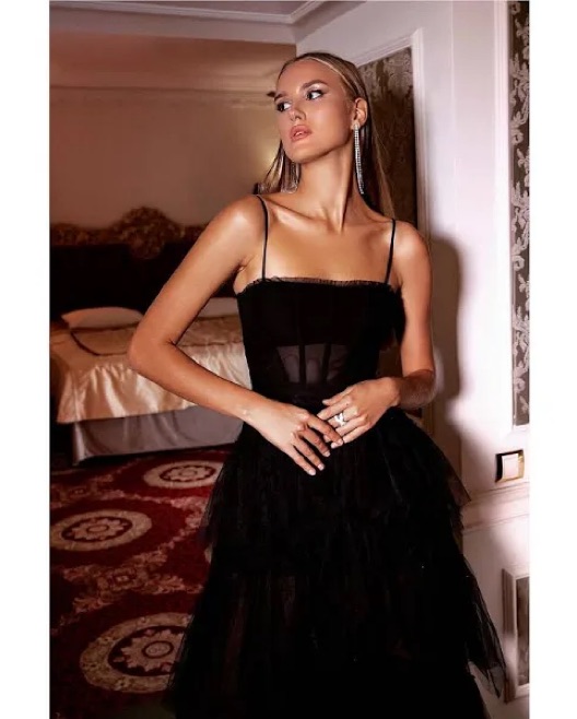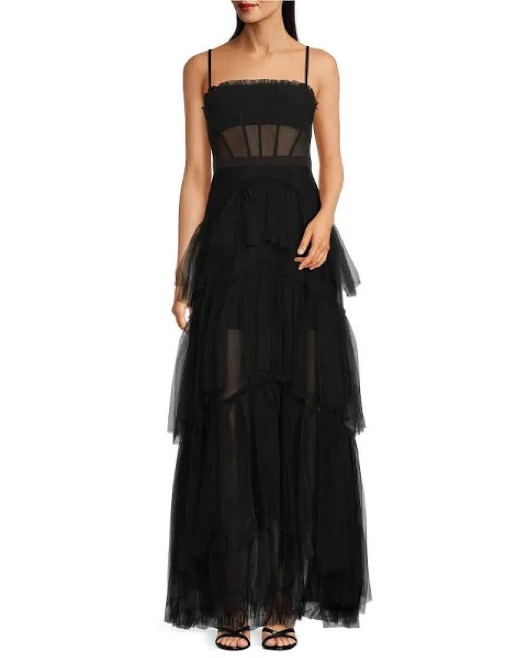Corset-style bodice; side pockets; tiered skirt