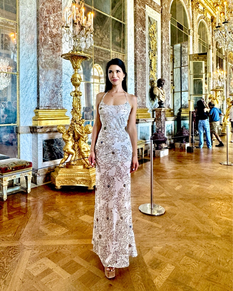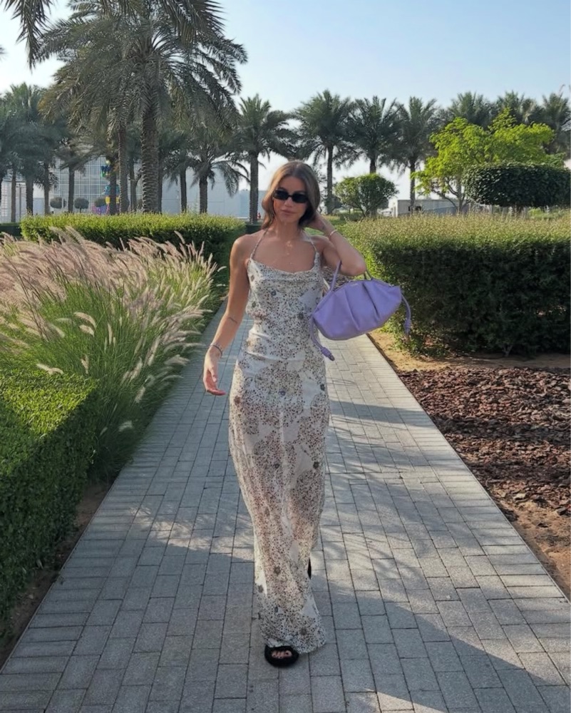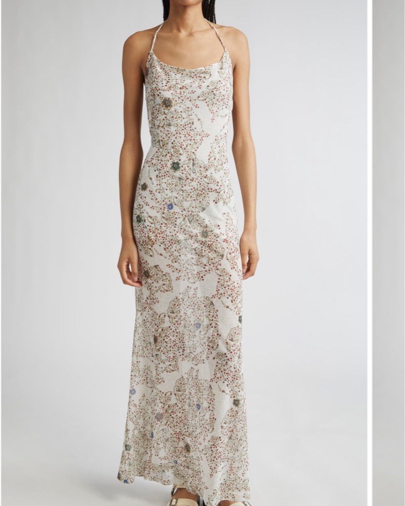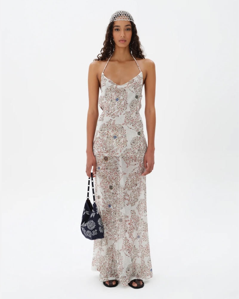 Siedres Nensi dress from their newest collection. Printed maxi dress with an open back and strings to tie back for a halter neck. Semi-lined on the inside.