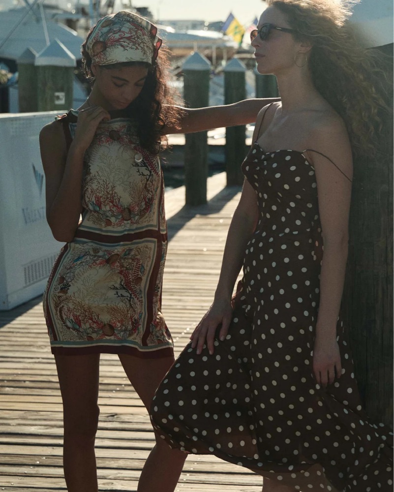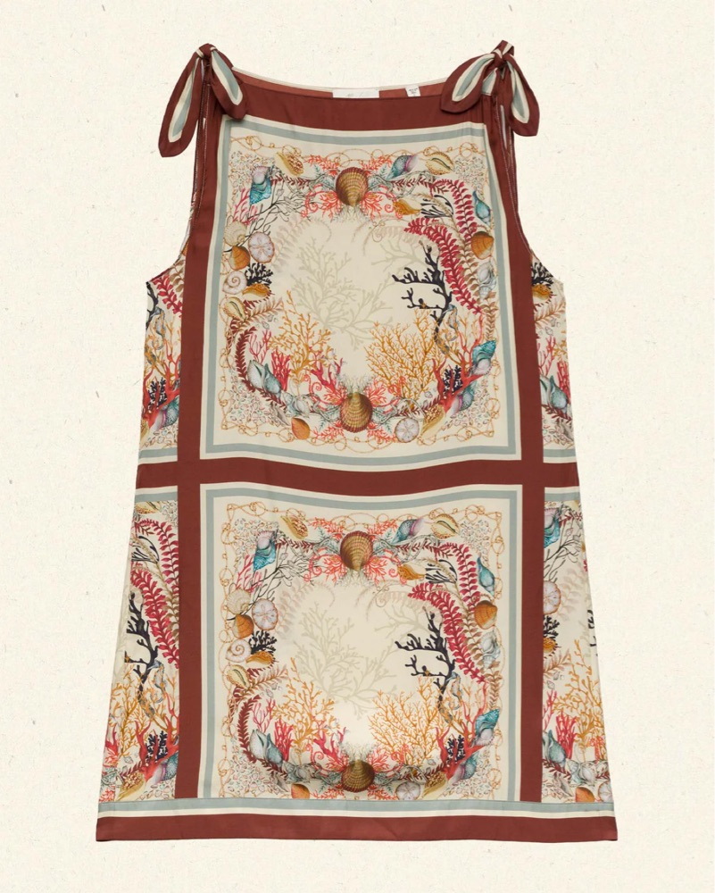 Silk mini dress with seashell pattern. Size XS (loose fit so fits XS/S) Adjustable shoulder ties. Belt also avail for rent if desired (called western belt in my listed closet)