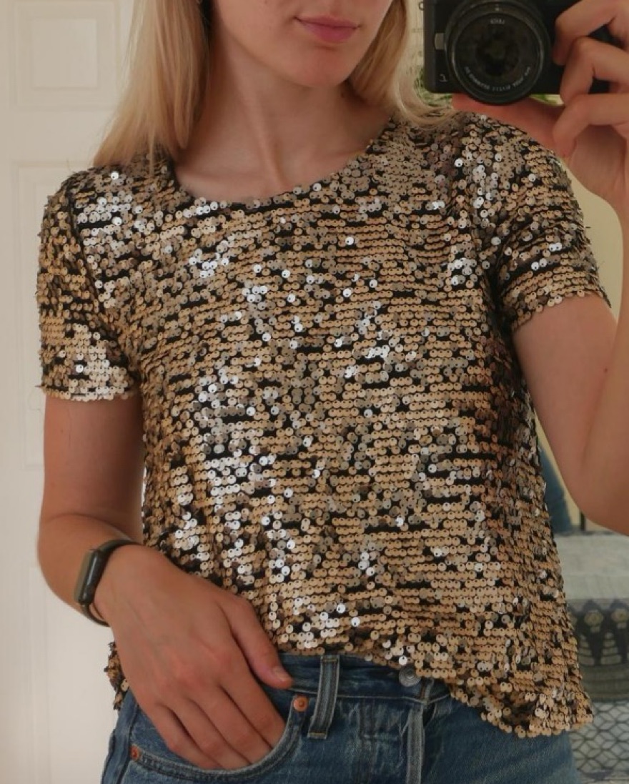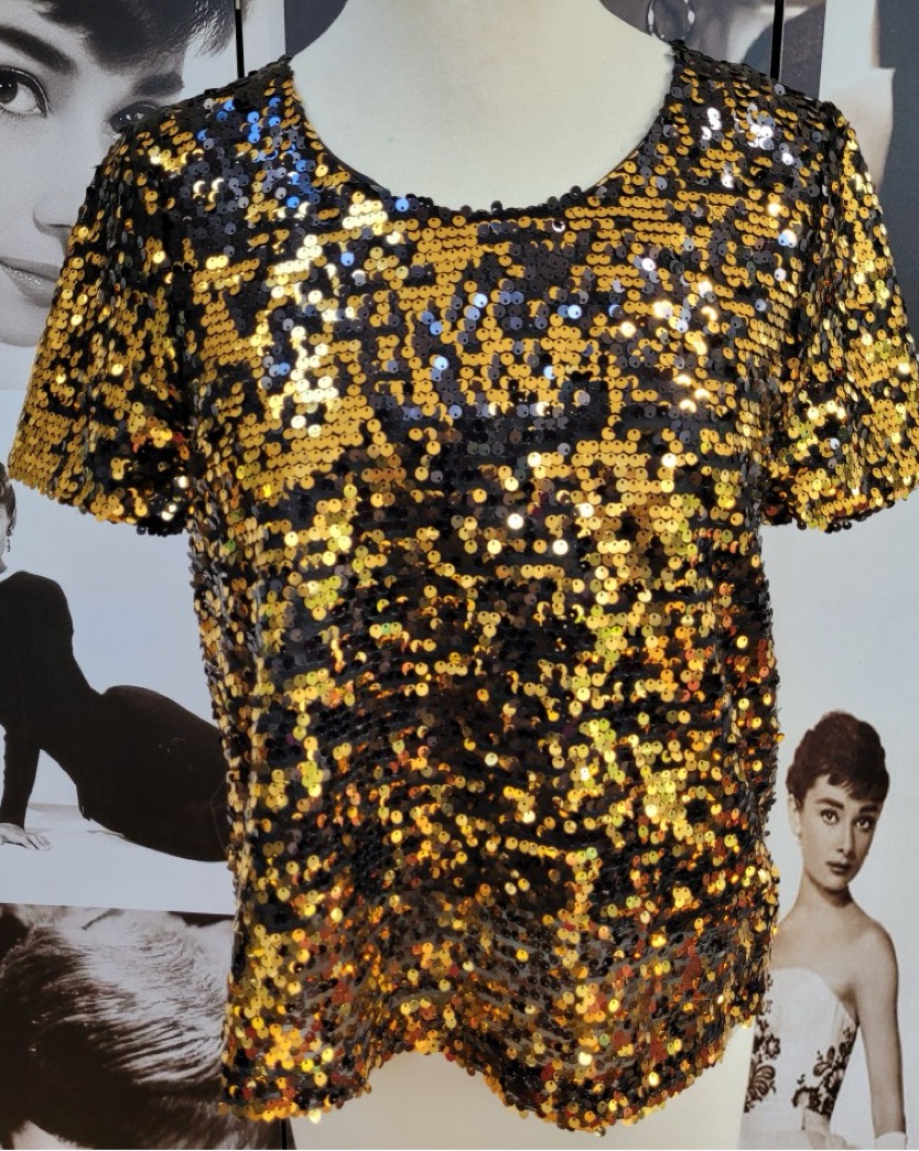 Topshop size 4 - fits XS and S. Gold palette sequin short sleeve top / shirt with gold sequins stitched on a black top. Great for celebrations, themed events, new year's. Shirt is fully lined to prevent itching.