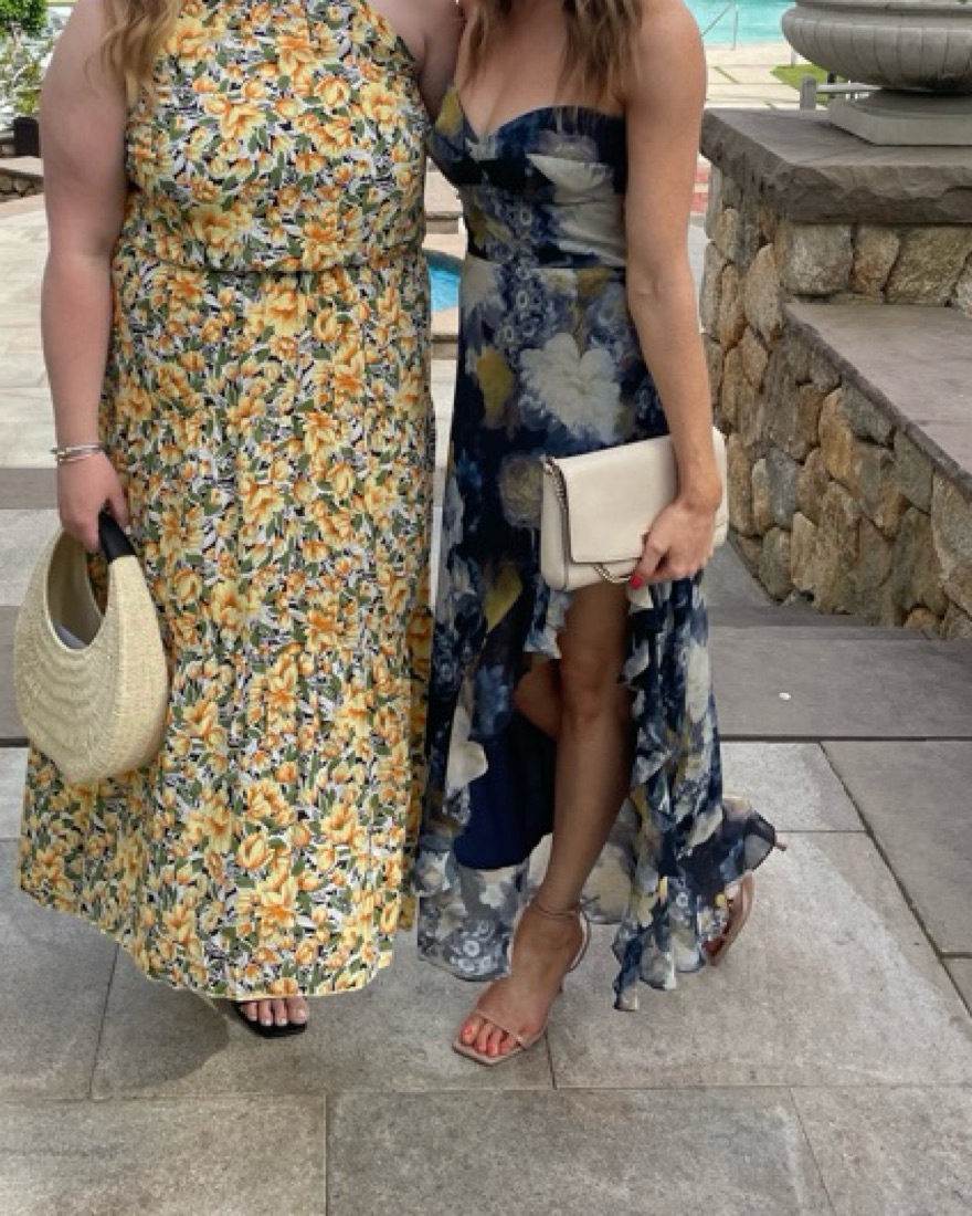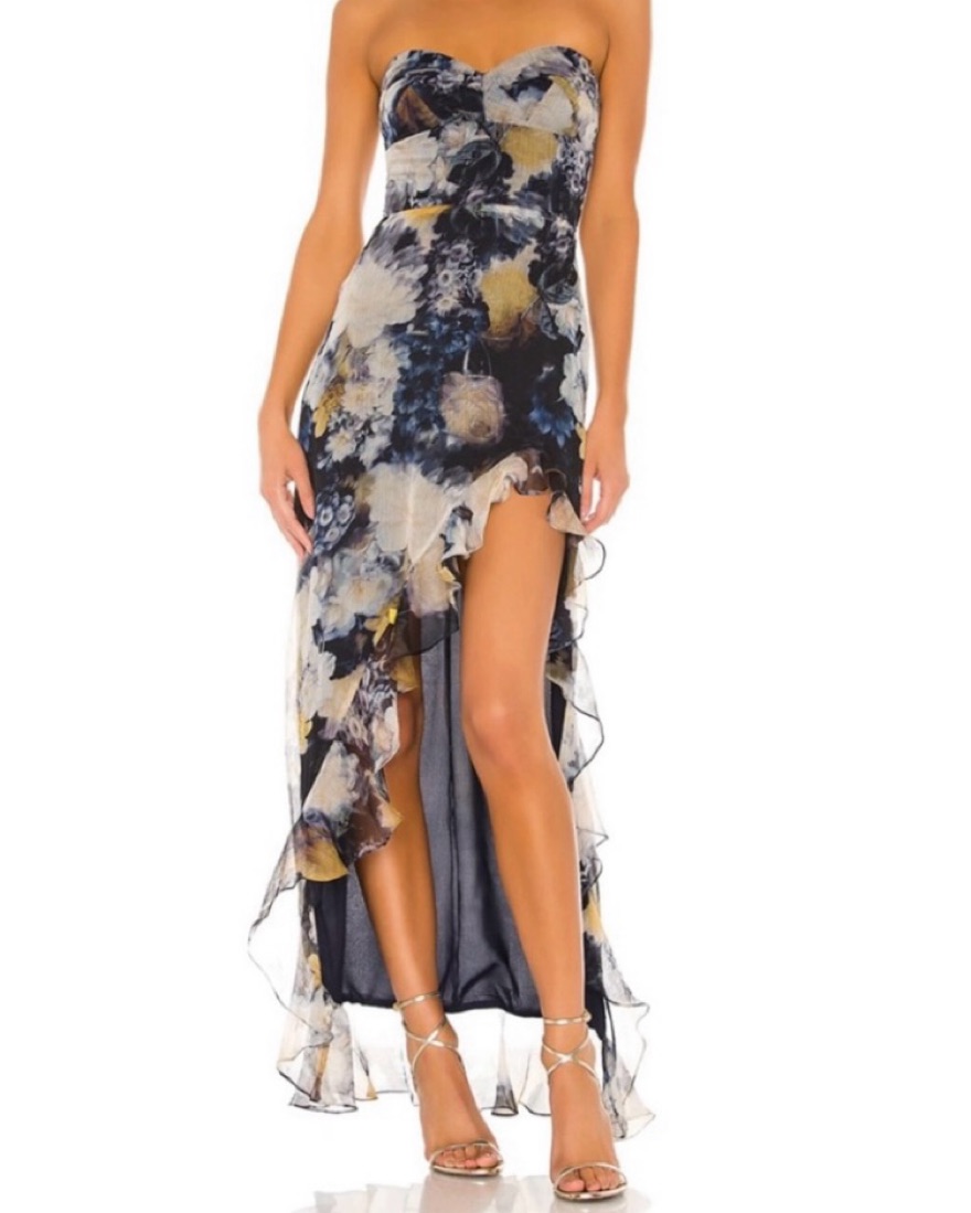 Eden Gown in floral blue/yellow/gold print. 58" from shoulder to hemline. I’m 5”5 for reference and have worn 2” and 3” heels with the dress. Perfect for spring and summer weddings and formal events.