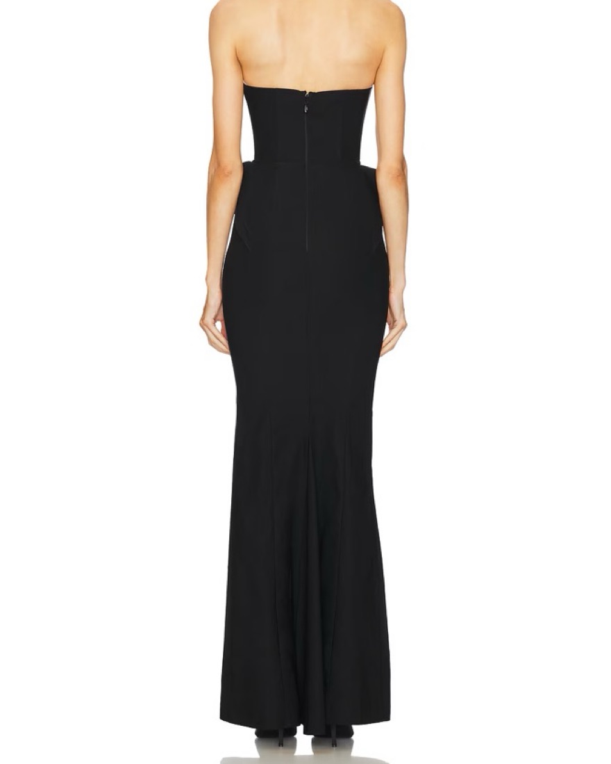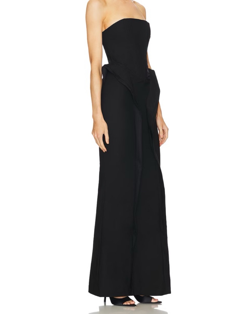 This striking black maxi dress is perfect for a formal event or special occasion. The sleek, strapless design creates a sophisticated look. Self: 74% viscose, 22% nylon, 4% elastaneLining: 97% cotton, 3% elastaneDry clean onlyHidden back zipper closureBoned bodiceMidweight crepe fabricNeckline to he