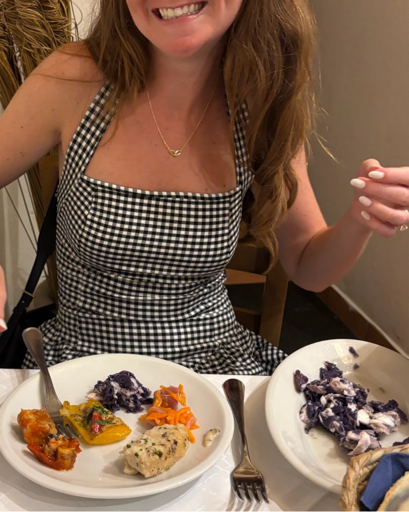 Stretchy fabric, halter dress. So comfy! Random thrift store find but feels brand new