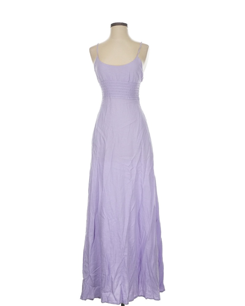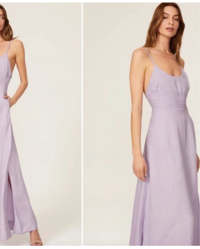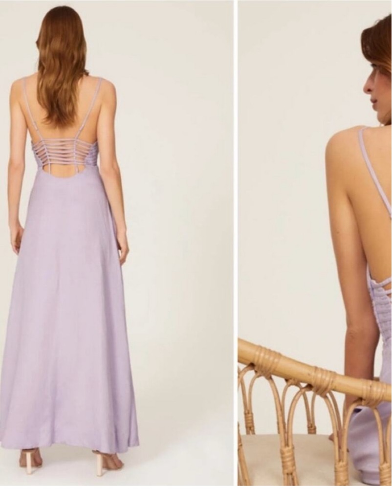 Great condition - no flaws! This stunning lavender maxi dress is perfect for a special occasion. The strappy open back adds a touch of glamour, making it a great choice for a formal event or wedding.