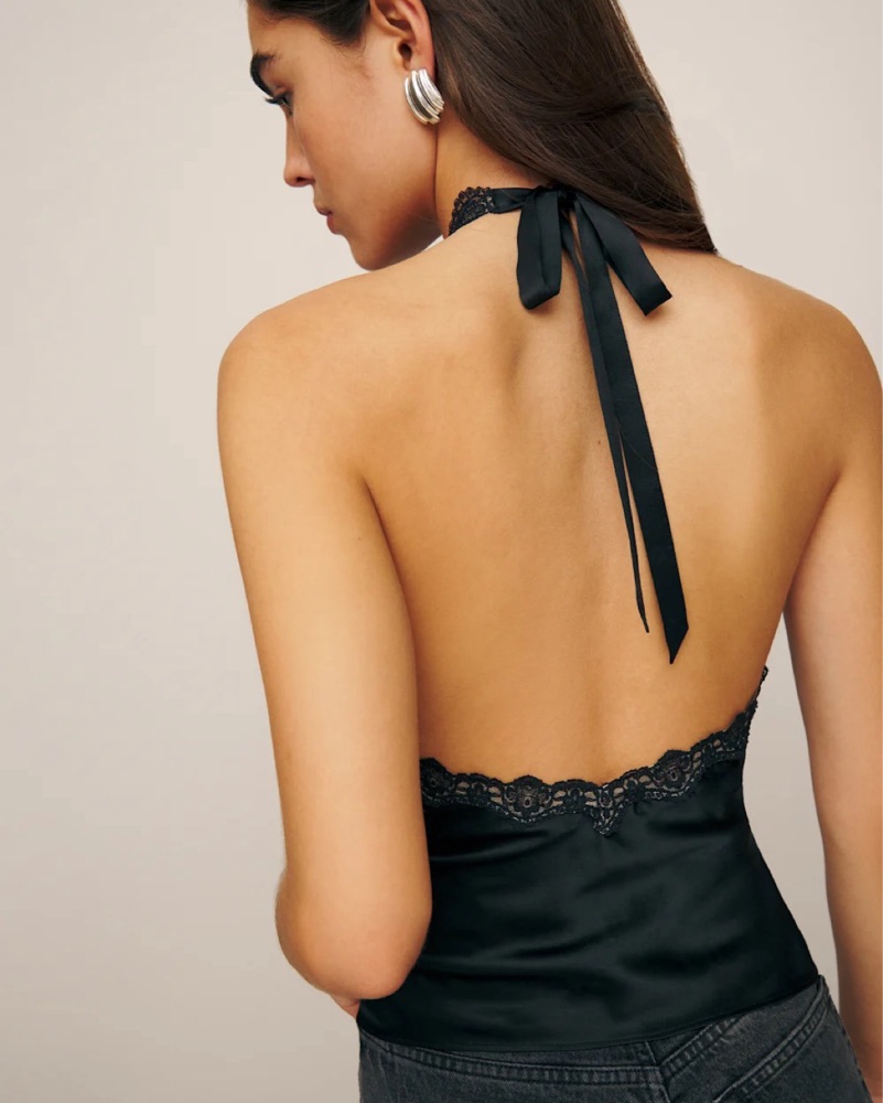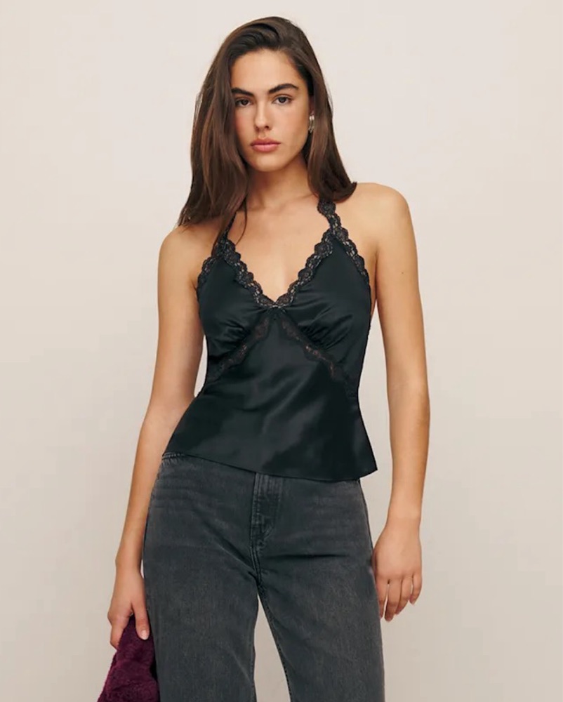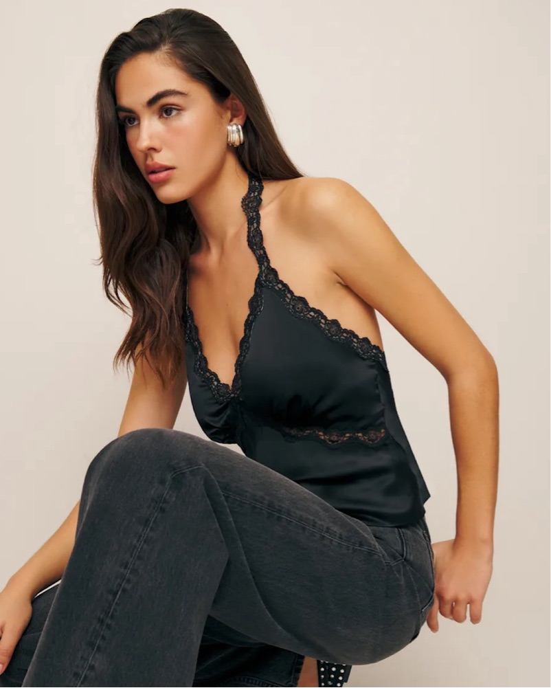 This chic black camisole is perfect for a night out or a special occasion. The satin fabric and lace detailing add a touch of elegance and femininity.
