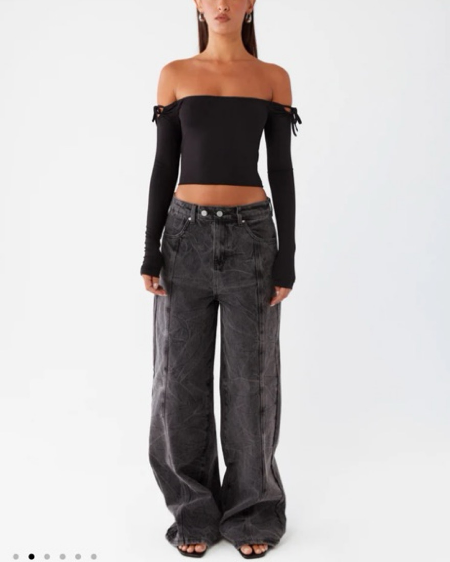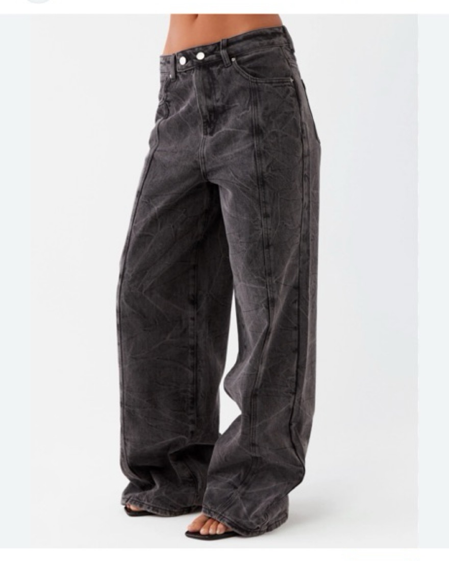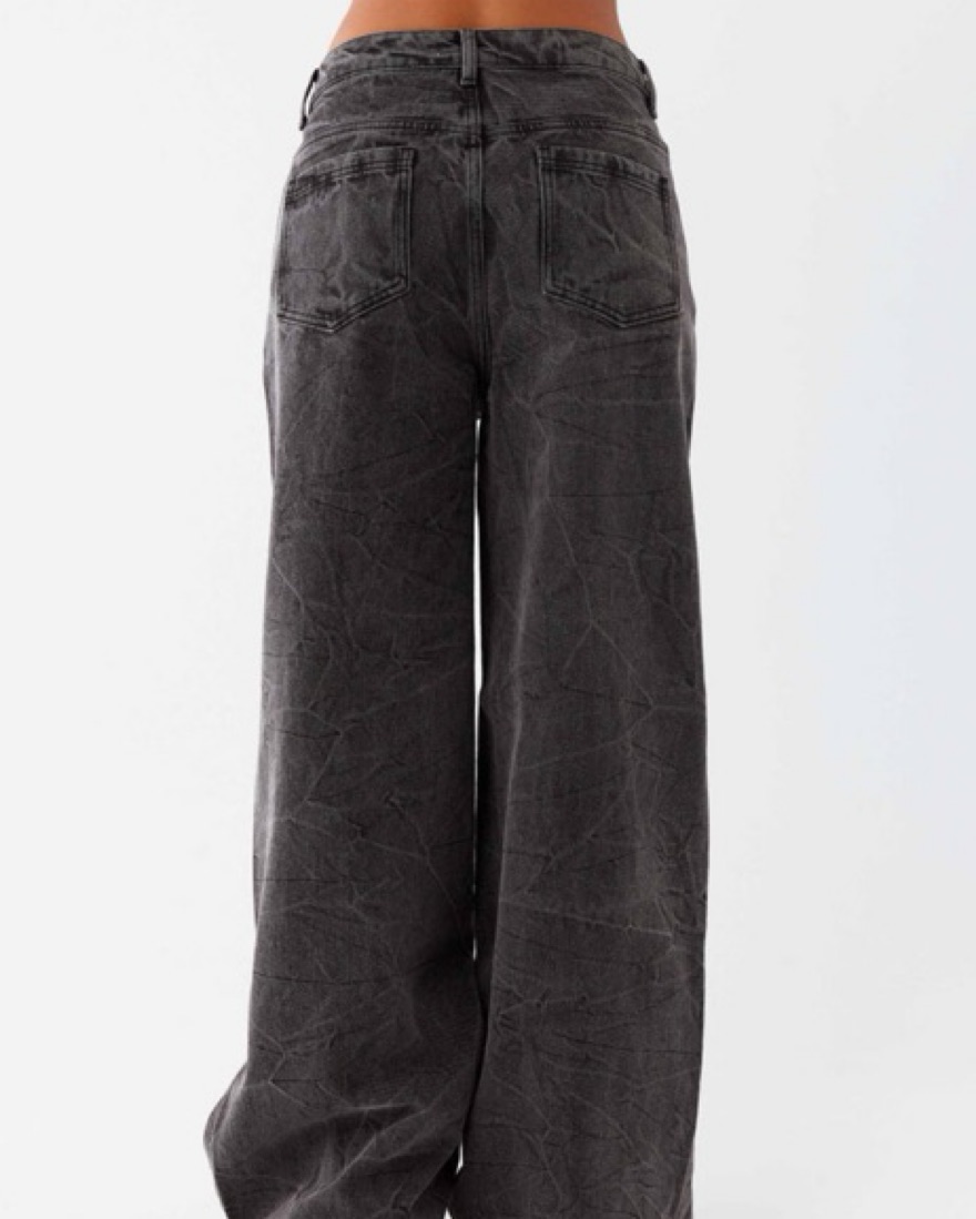 These high-waisted, wide-leg denim jeans feature a distressed, vintage-inspired look with a relaxed, effortless vibe.