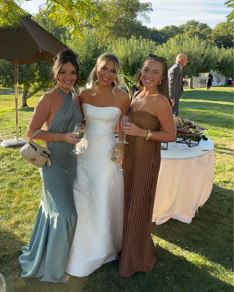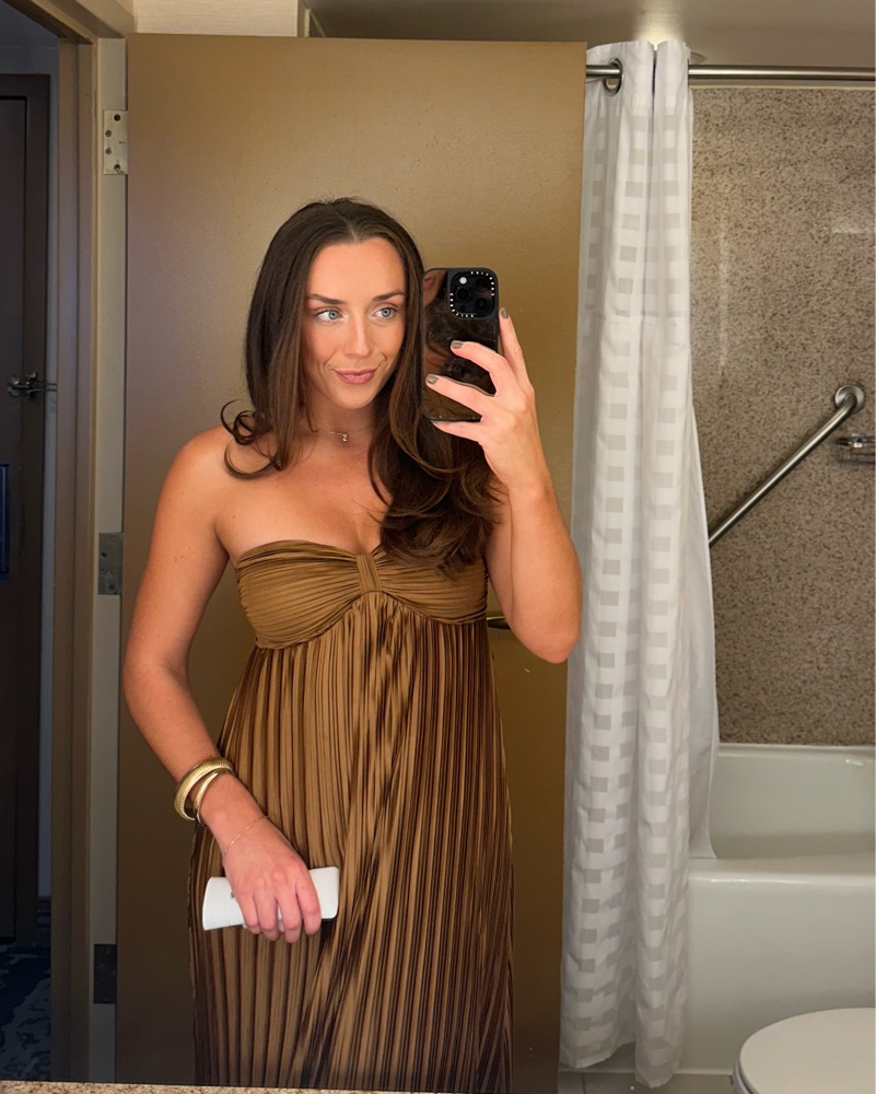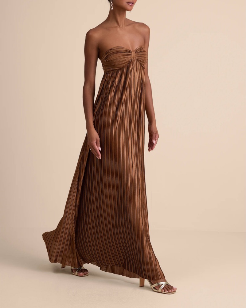 This shimmering pleated bronze maxi dress is perfect for a special occasion or formal event. It fits S-M but works best for smaller bust - the website says cup size A-C. I’m 5’4 and with heels it was all the way to the floor.