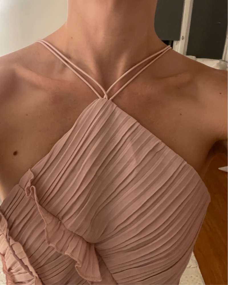 This dress is a beautiful pale pink with sculptural pleats that add visual movement and texture. Asymmetrical bottom (but dress is ankle length). Slit halfway up the left leg. Lightweight fabric, and very comfortable. Perfect for spring/summer weddings!