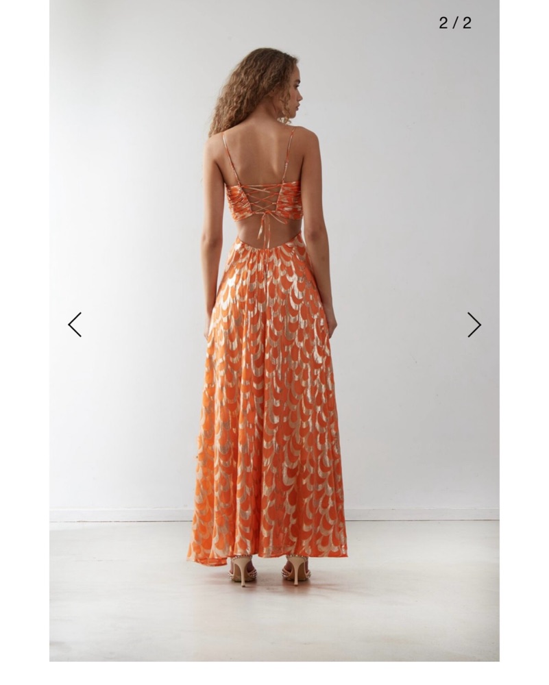 Beautiful orange and gold dress with open lace up back. Worn to a summer wedding and on vacation.