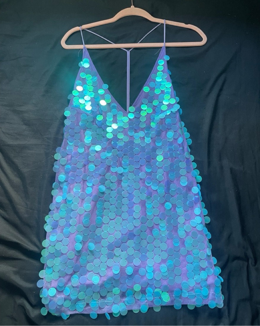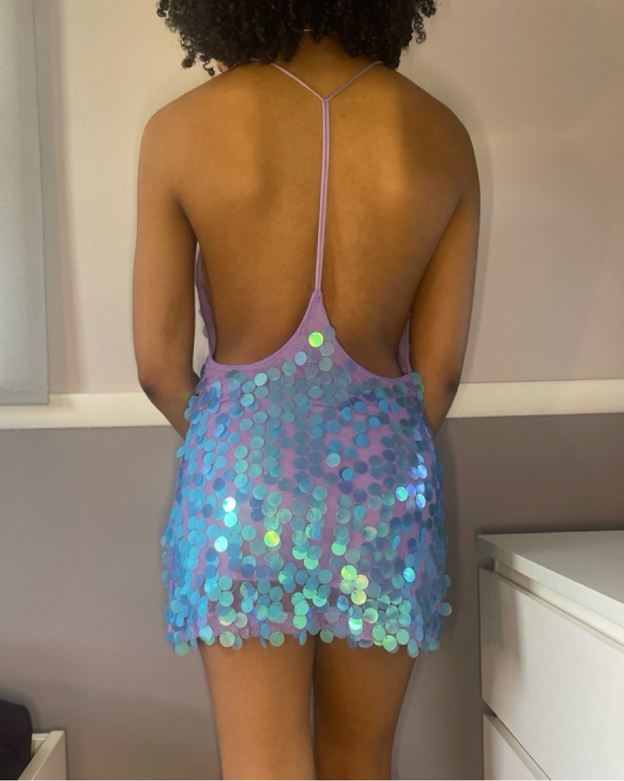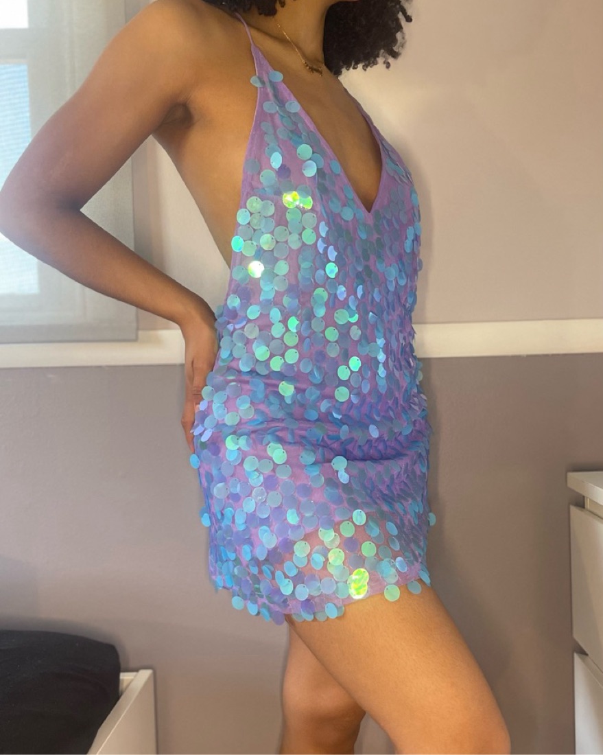 low back, large blue iridescent sequins, purple mini dress