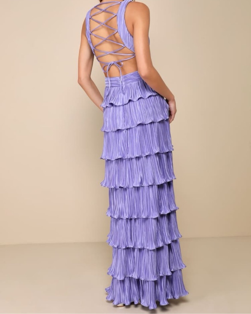 Satin Pleated Tiered Lace-Up Maxi Dress