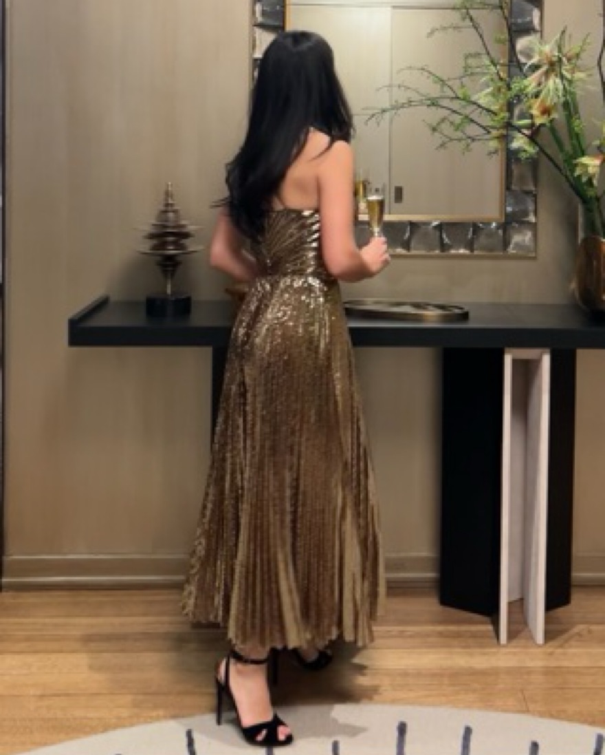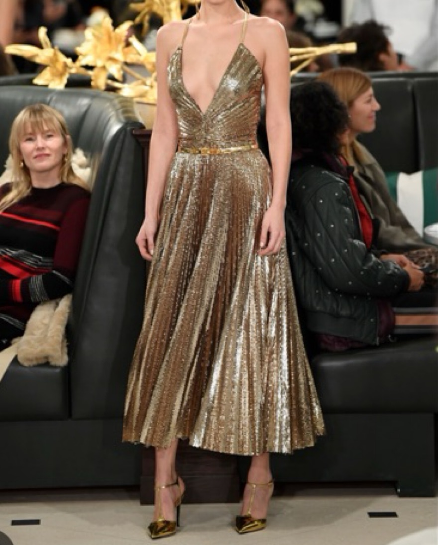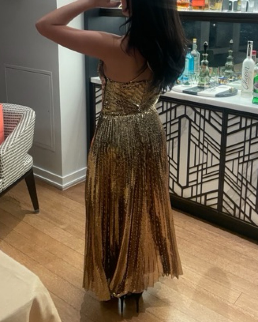 As worn by Bella Hadid for Ralph Lauren Purple Label, becautiful sequin gold dress with pleated skirt and bustier top with gold criss cross medal back straps. Perfect for a special occasion, size 2