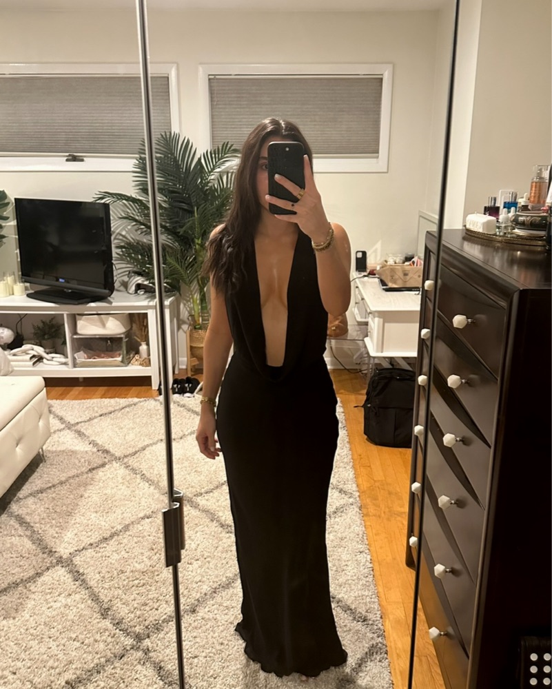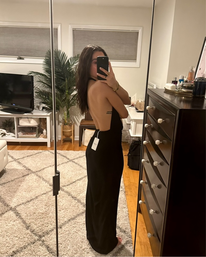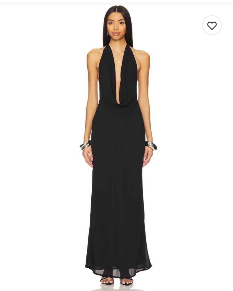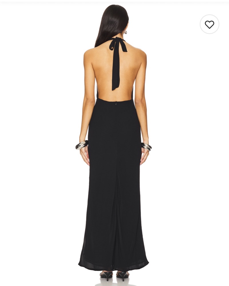 Soo elegant and sexy draping black maxi halter dress with open back. Has a zipper in the back and can tie the top however you want (halter, criss cross, etc)