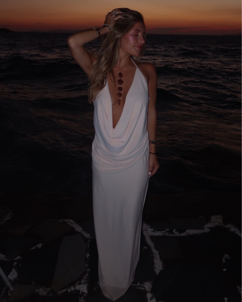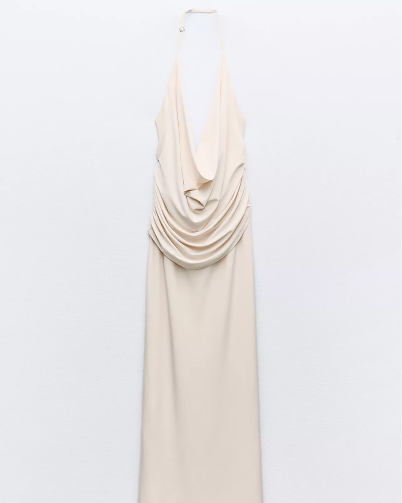 This stunning halter dress features a dramatic draped design that creates a captivating silhouette.