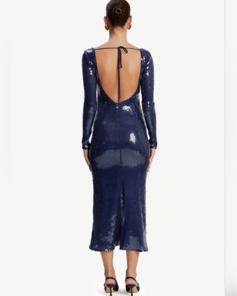 Midi length navy blue Bardot sequin dress. Tags still on