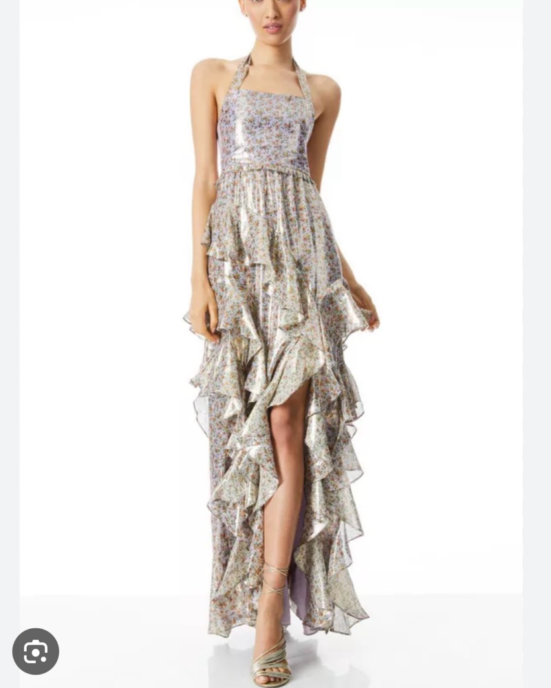Size 6 - fits like a medium Extremely comfortable! - Halter neck (adjustable tie) - Floral print with shimmer - Smocked backing - Back zipper closure