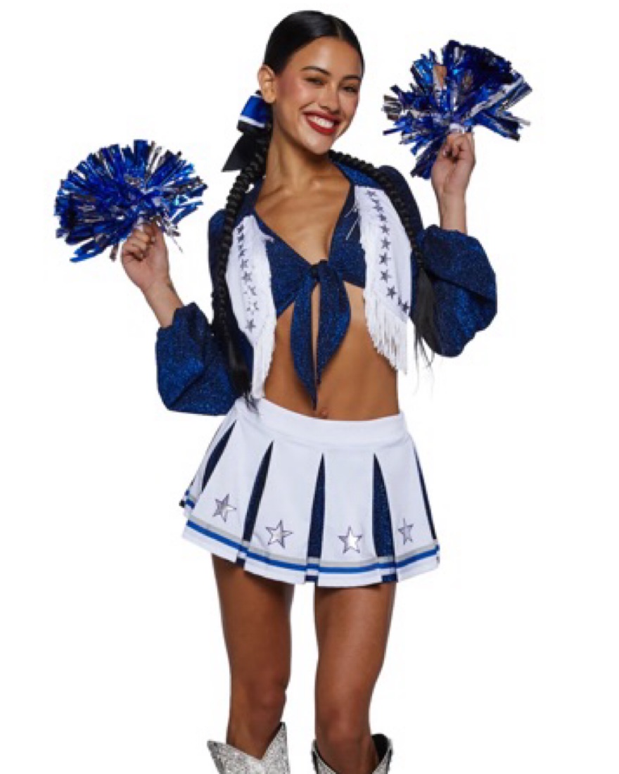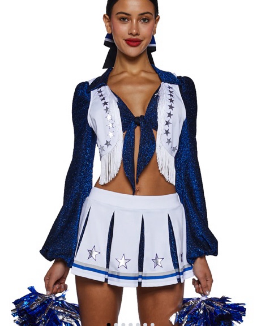 Dallas Cowboy Cheerleader Costume set. Glitter crop top with attached vest, star print, plunging neckline and matching pleated mini skirt, metallic poms, βtouchdownβ garment and bow included. Top is adjustable for different chest sizes. Iβm a 32D/DD for reference.