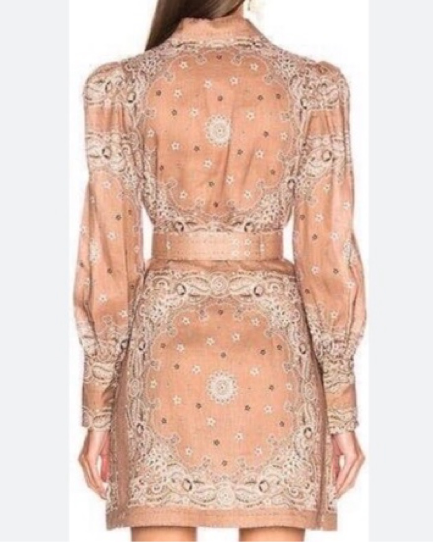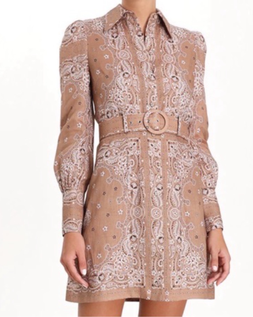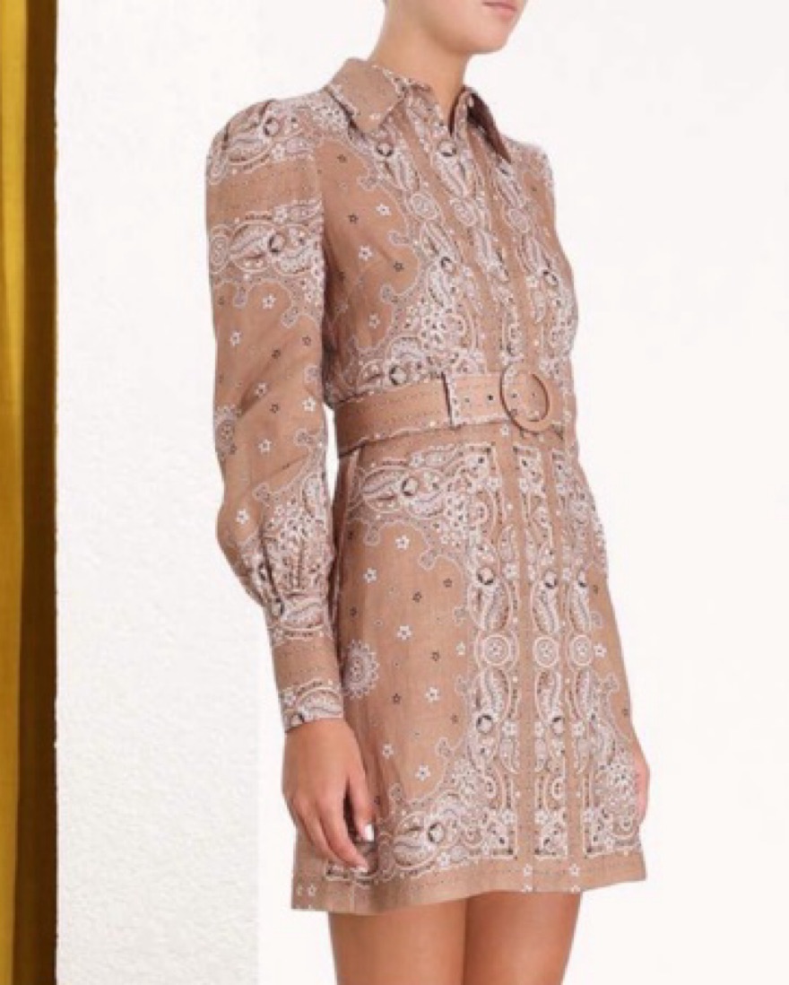 The honour bandana short dress in tan bandana print from the Summer Swim 2019 collection. A linen shirt dress with tailored bodice, puff shoulders and blouson sleeves. Removable belt and button up front closure.