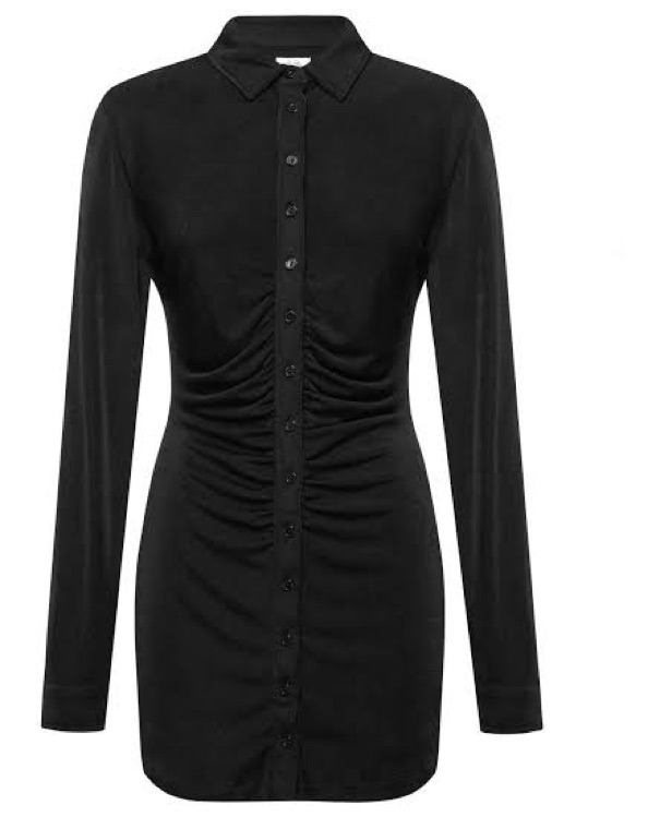With Jean Andy Dress in black size xs. very stretchy material can fit size small! long sleeve mini dress featuring a ruched waist and button-down front.