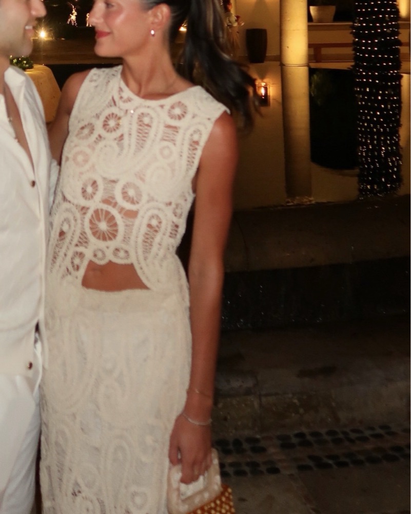 Beige crochet knit skirt set. Very comfortable and easy to wear. Skirt has a lining so the bottom isn’t see through. I wore stick boobs for the top and it was perfect