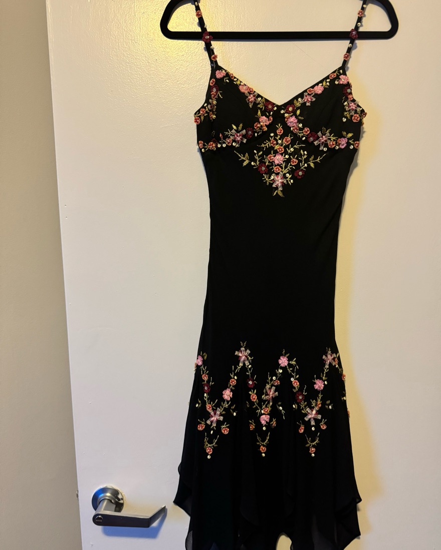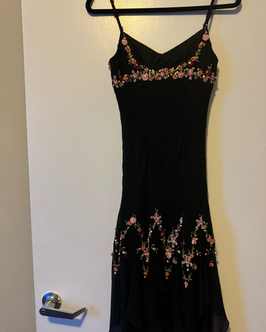 Vintage Sue Wong 90’s floral beaded fairy hem midi dress. 100% silk with polyester lining. Flower rosettes/embroidery/beads/sequins. Black with pink and green. No flaws. Perfect for a wedding or any special occasion. This is my baby and she is DELICATE, please be careful with her! Fits like an XS