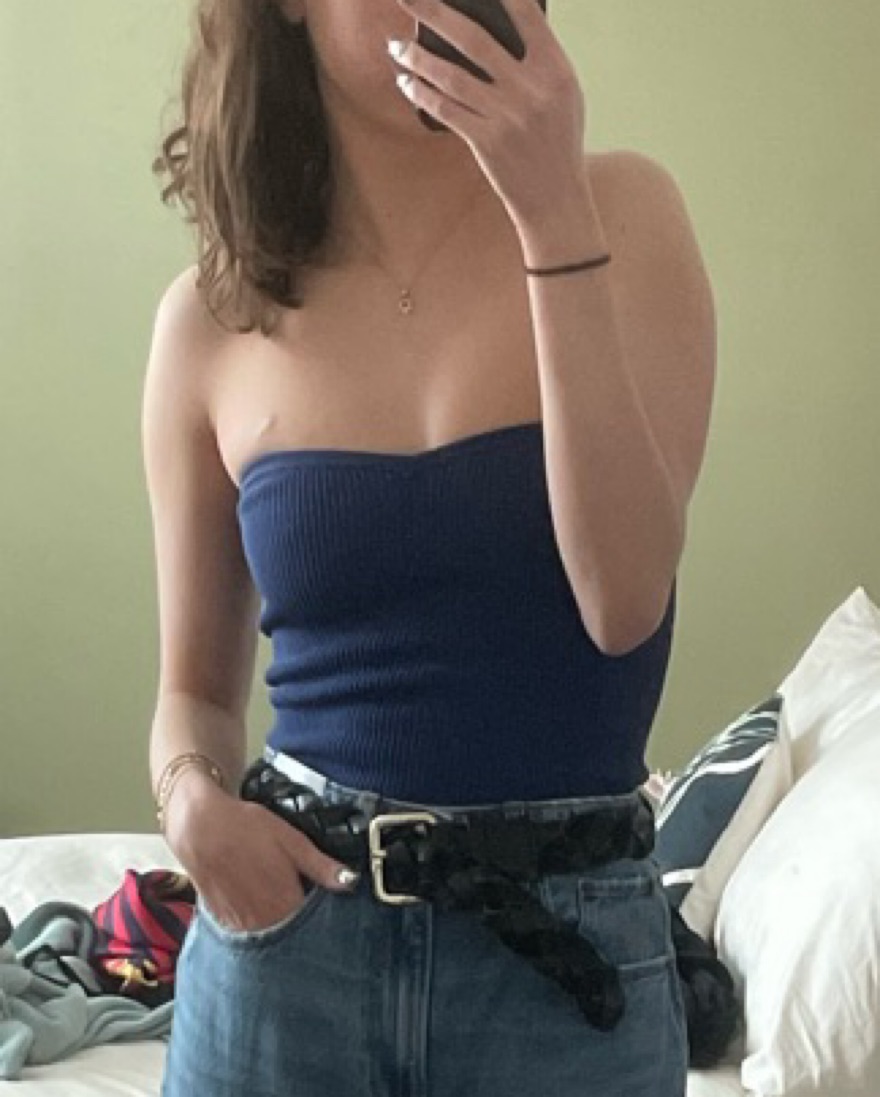 Super comfy ribbed sweetheart neckline strapless top. Bright blue goes with everything.