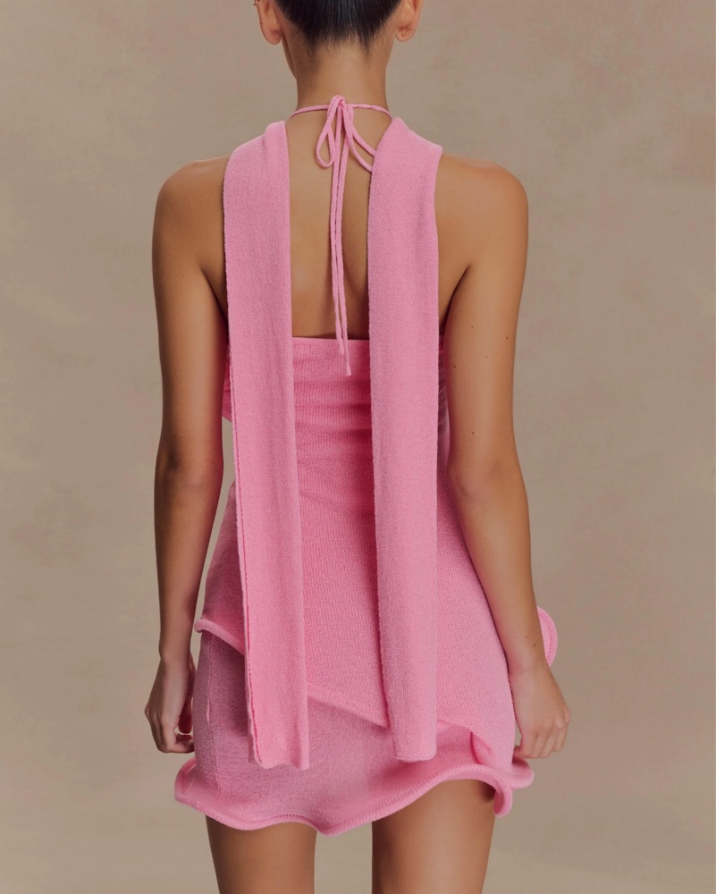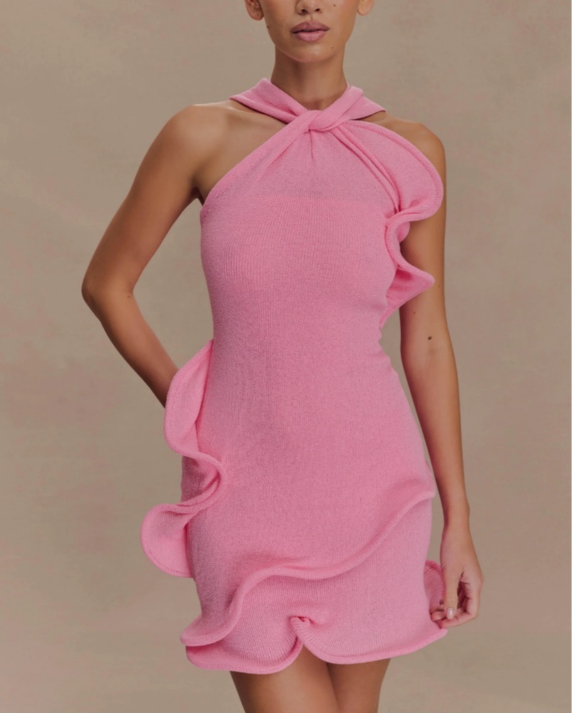 This stunning halter dress is perfect for making a statement at your next formal event or night out on the town. The vibrant pink color and cascading ruffles create a bold, eye-catching look.