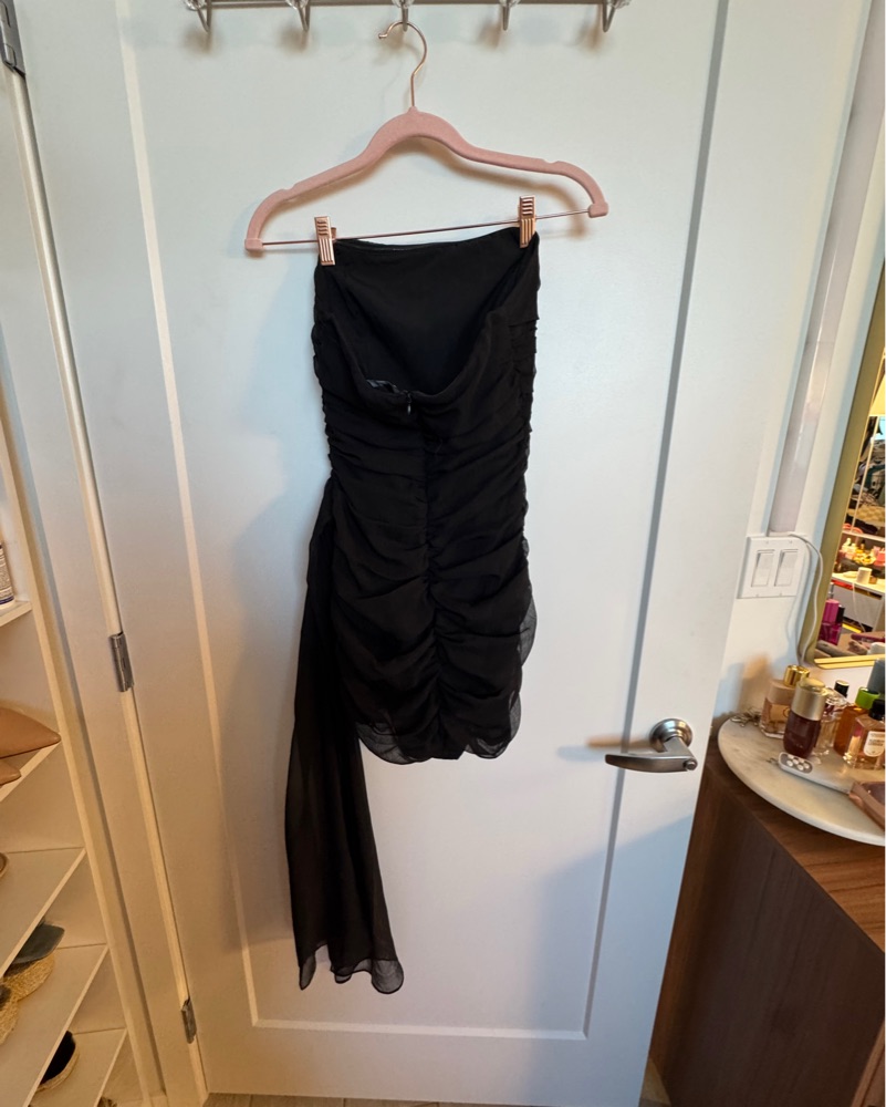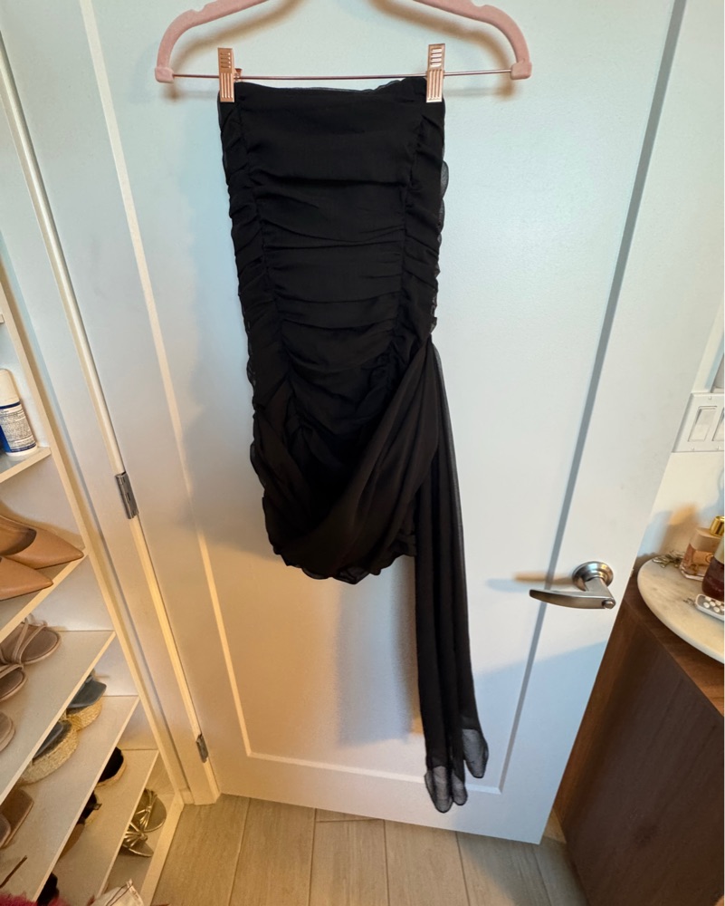 This sleek and sophisticated black dress is perfect for a night out or special occasion. The ruching and draped design creates a flattering and feminine silhouette.