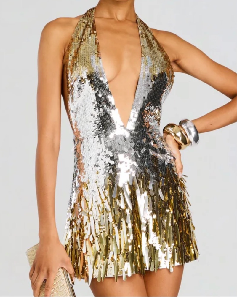 Mixed metal sequin dress backless halter mini low v neck plunge perfect for NYE New Year’s Eve