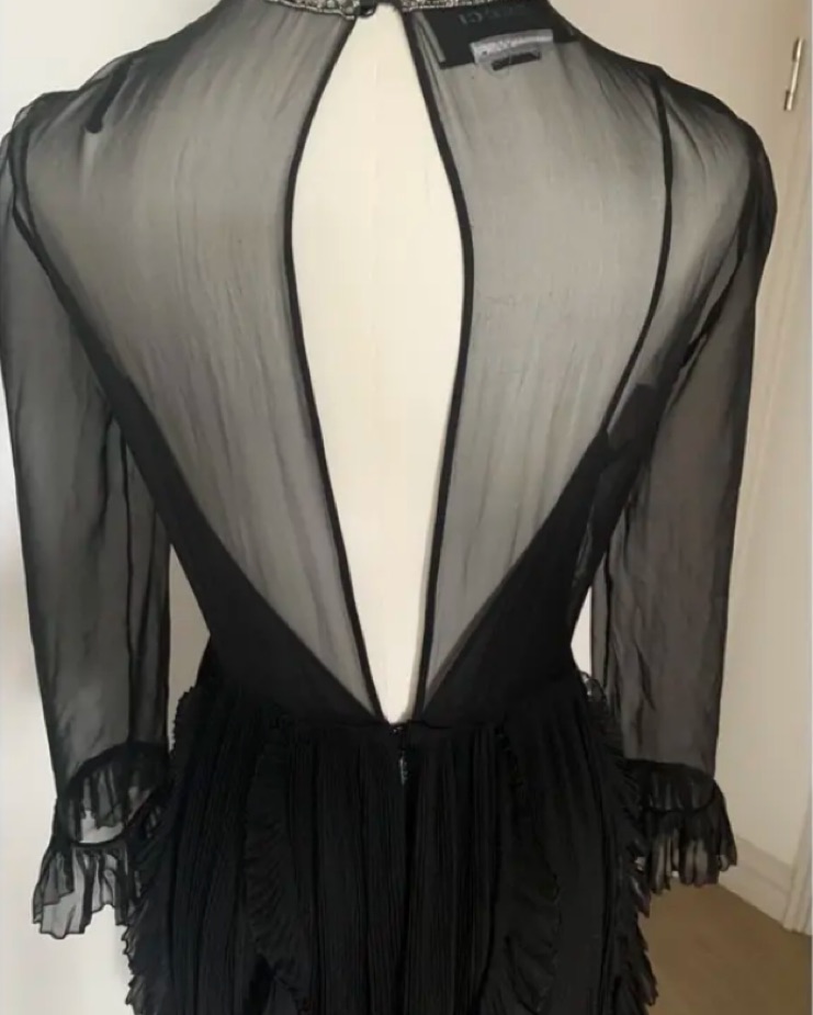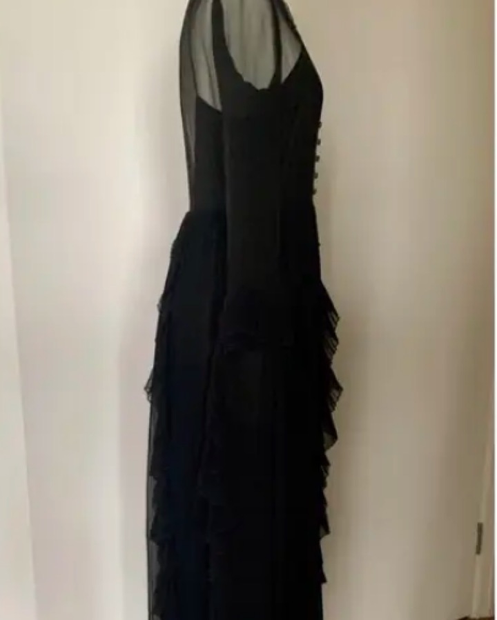 Rare, floor length, black chiffon Alessandro Michele designed gown, with jeweled bow, collar and button embellishments.