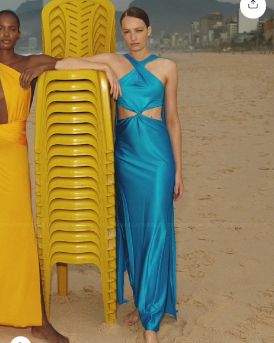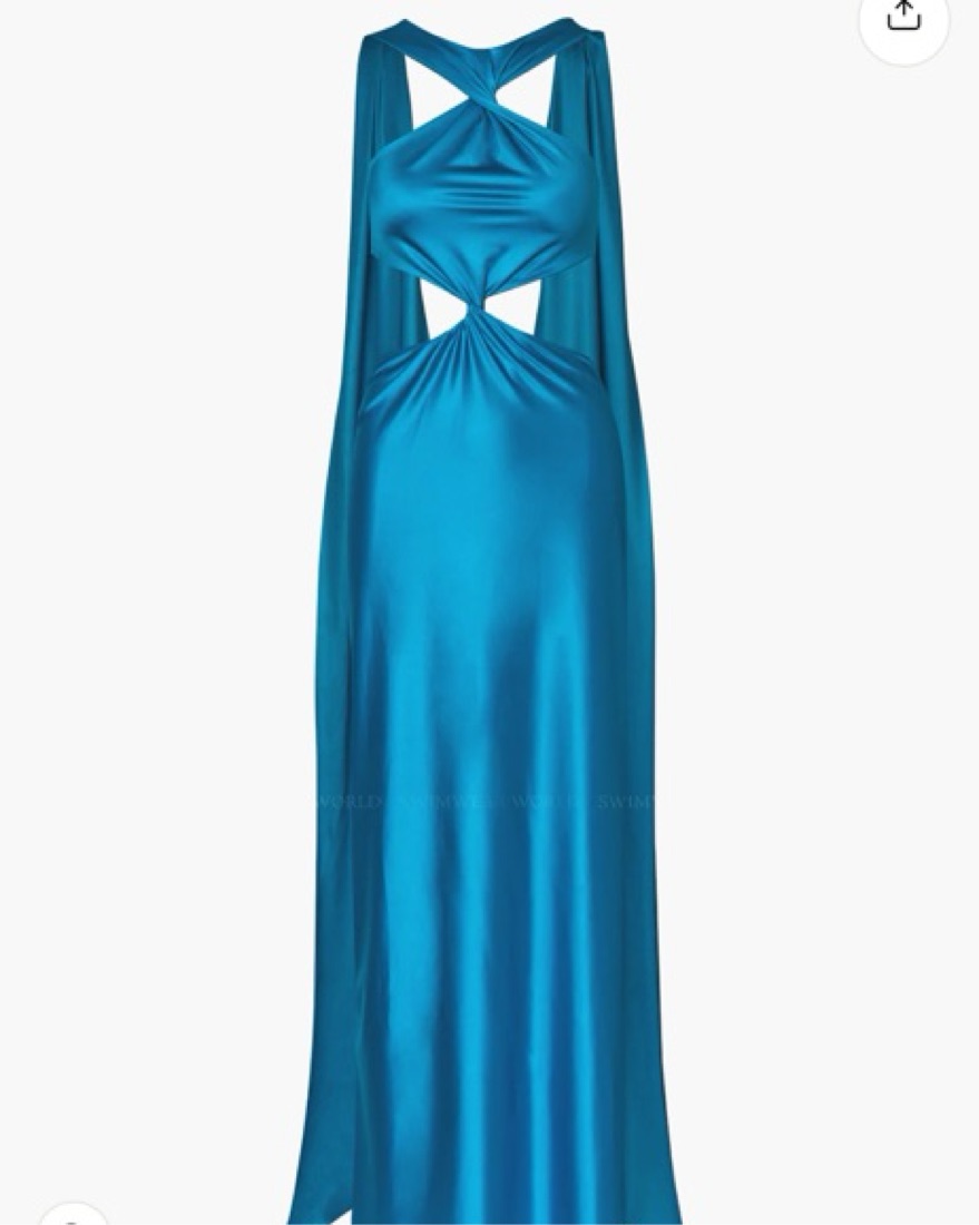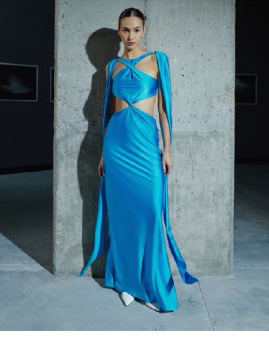 This striking Ribera maxi dress in a vibrant olive hue is a head-turning piece that commands attention. The dramatic cutouts and flowing silhouette create a captivating look.