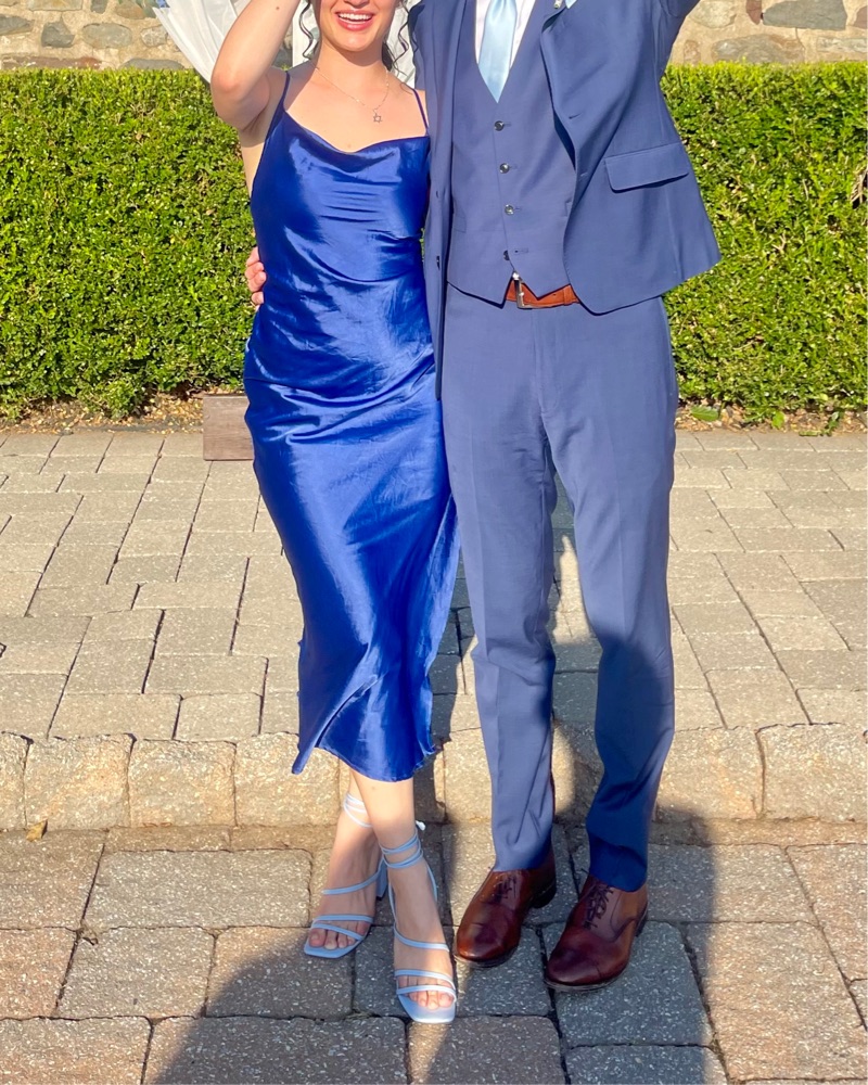 Thrifted for my friends wedding! Amazing for the summer. Adjustable straps and a sizable slit so it’s breathable and danceable!! Not me in one of the photos just a good pic of the dress!
