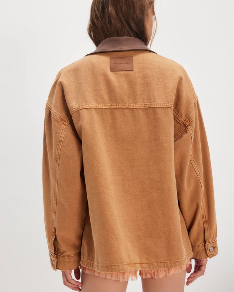 jean jacket. khaki color with dark brown collar. oversized boxy fit.